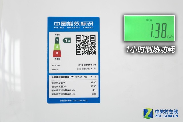 这款苏宁空调为一款一级能效的全直流变频空调,在温度控制和节能方面,相对于传统的变频空调和直流变频空调拥有更好的表现。自2013年10月起,变频空调新国标开始正式实施,最低能效等级从5级提至3级,并对空调能效等级有了较大幅度的提升,空调想达到1级能效开始变得比较困难。而本次测试的这款苏宁极物空调全年能效消耗率为4.73,本次1小时制暖功耗为1.38KW/H,能够看出这款空调在功耗控制方面较为出色的能力。