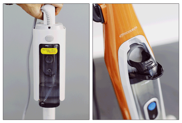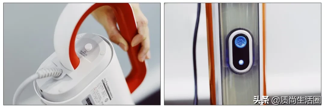 两款样品的蒸汽开关按钮都在水箱上面,因为deerma/德尔玛的水箱在上面,无需弯腰就能控制蒸汽开关按钮,而Shark/鲨客的水箱位置偏下,每次按的时候都要弯腰,略显麻烦。