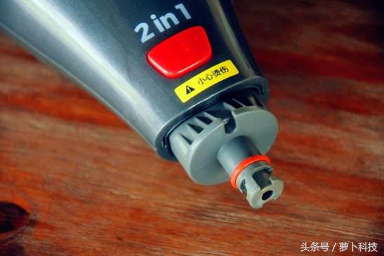 再往下就是二合一接头,可以用来连接各种刷头了,因为加热后的高温蒸汽都会经由这个口出去,所以在工作时要注意防止烫伤。