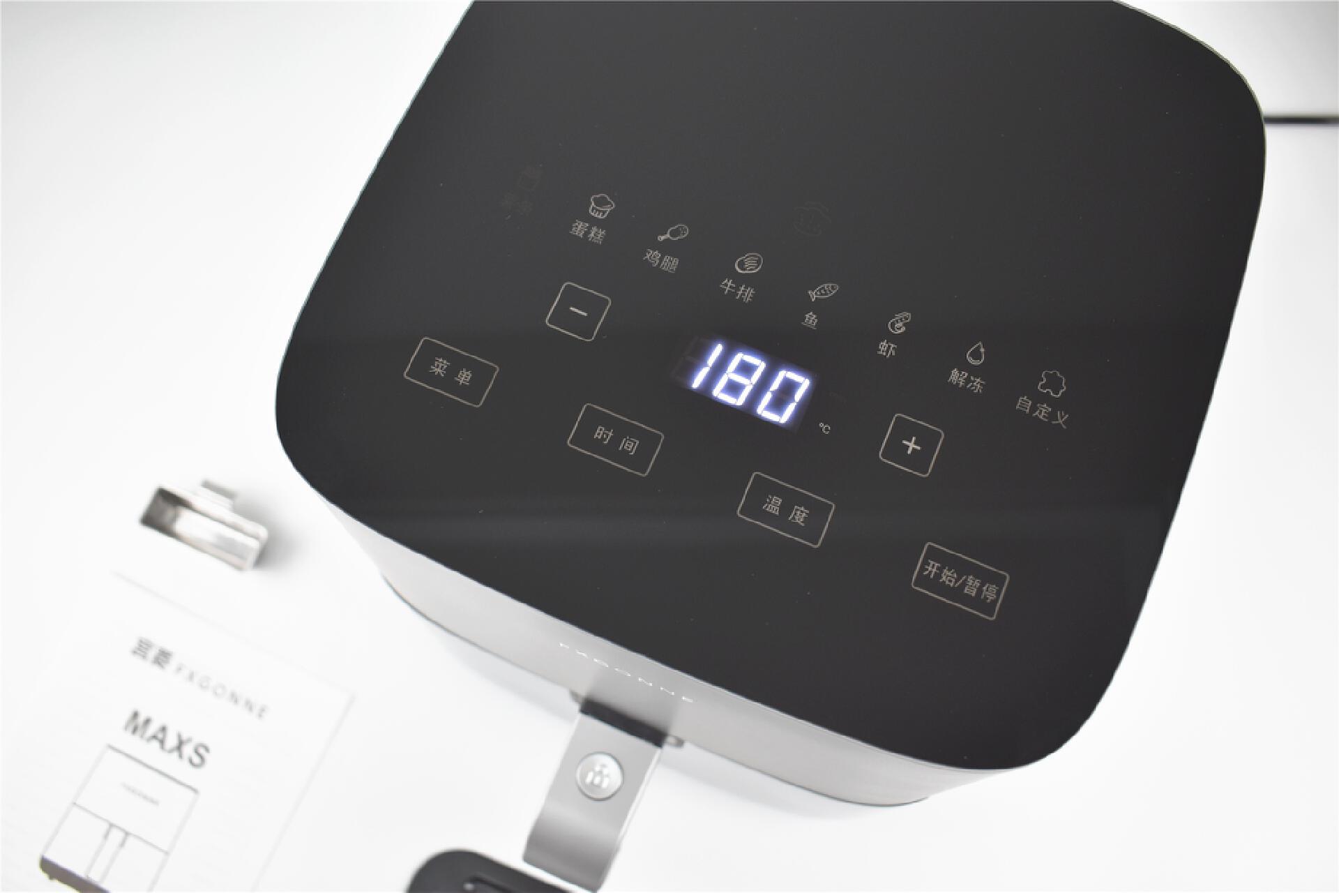 机器顶部的控制面板是触控设计,预设了8个菜单键,并且支持60℃至200℃的超广温域,之前我使用的炸锅温控都是在80℃至200℃,宫菱Fxgonne的低温可以用于解冻食材,个人感觉挺实用的。