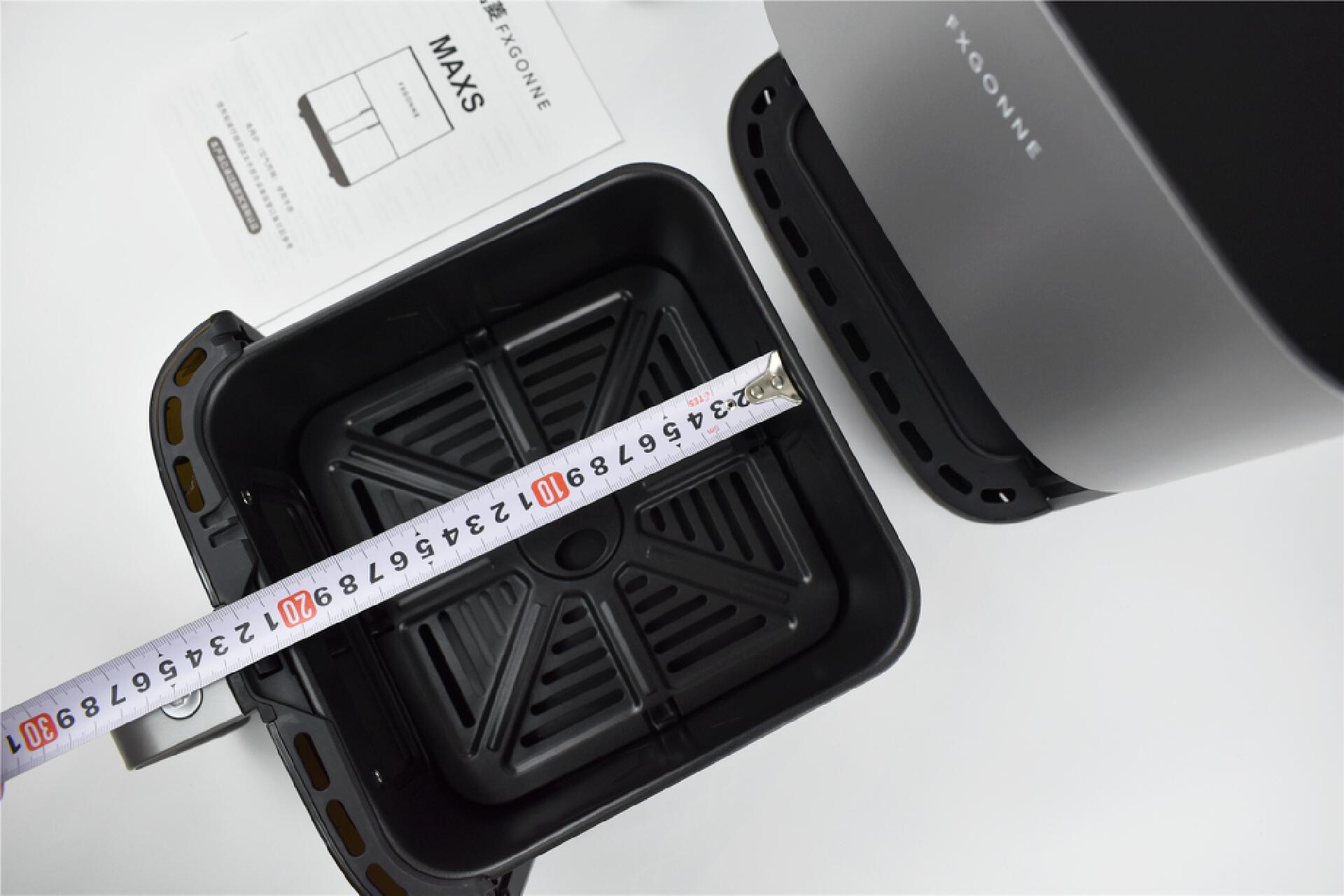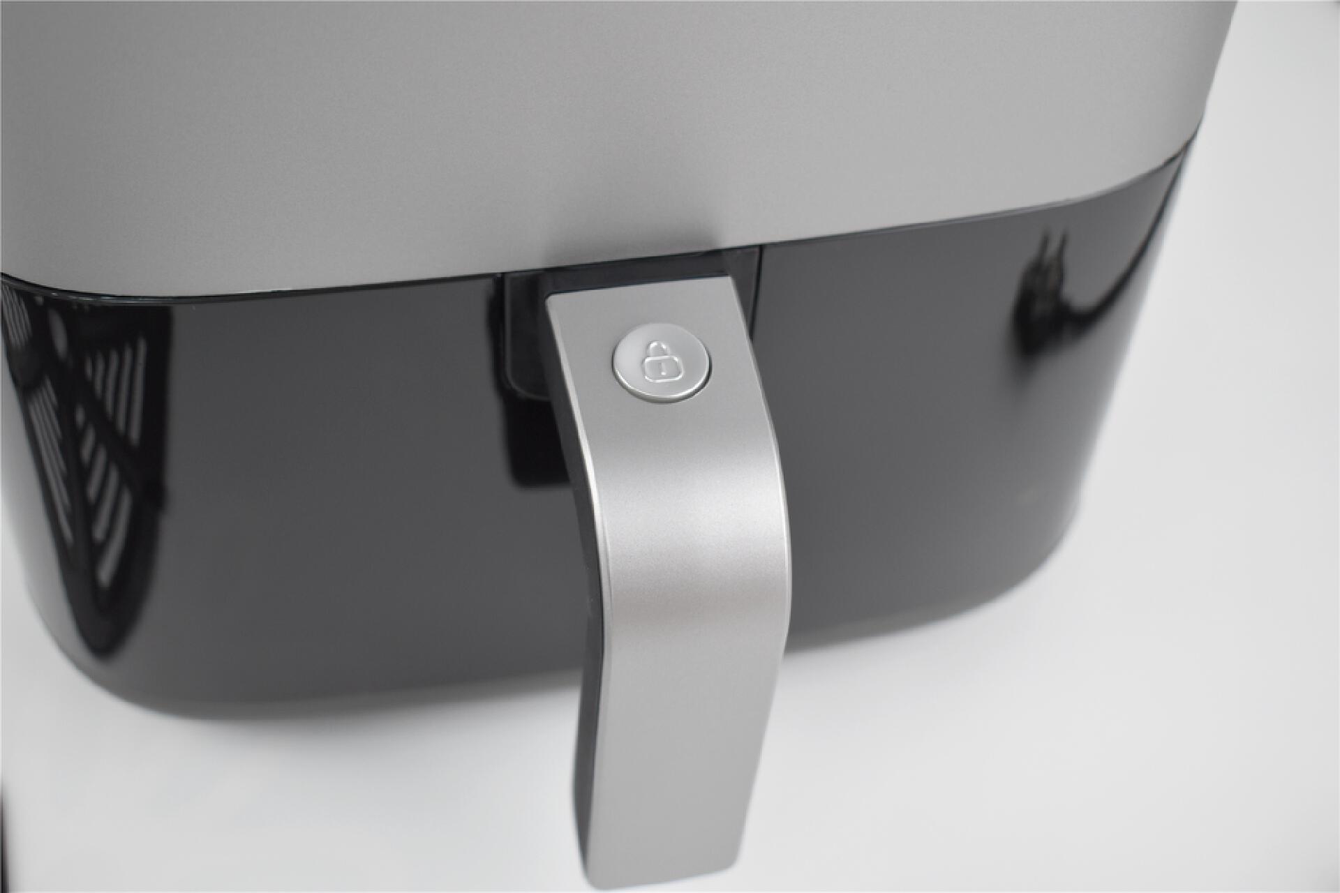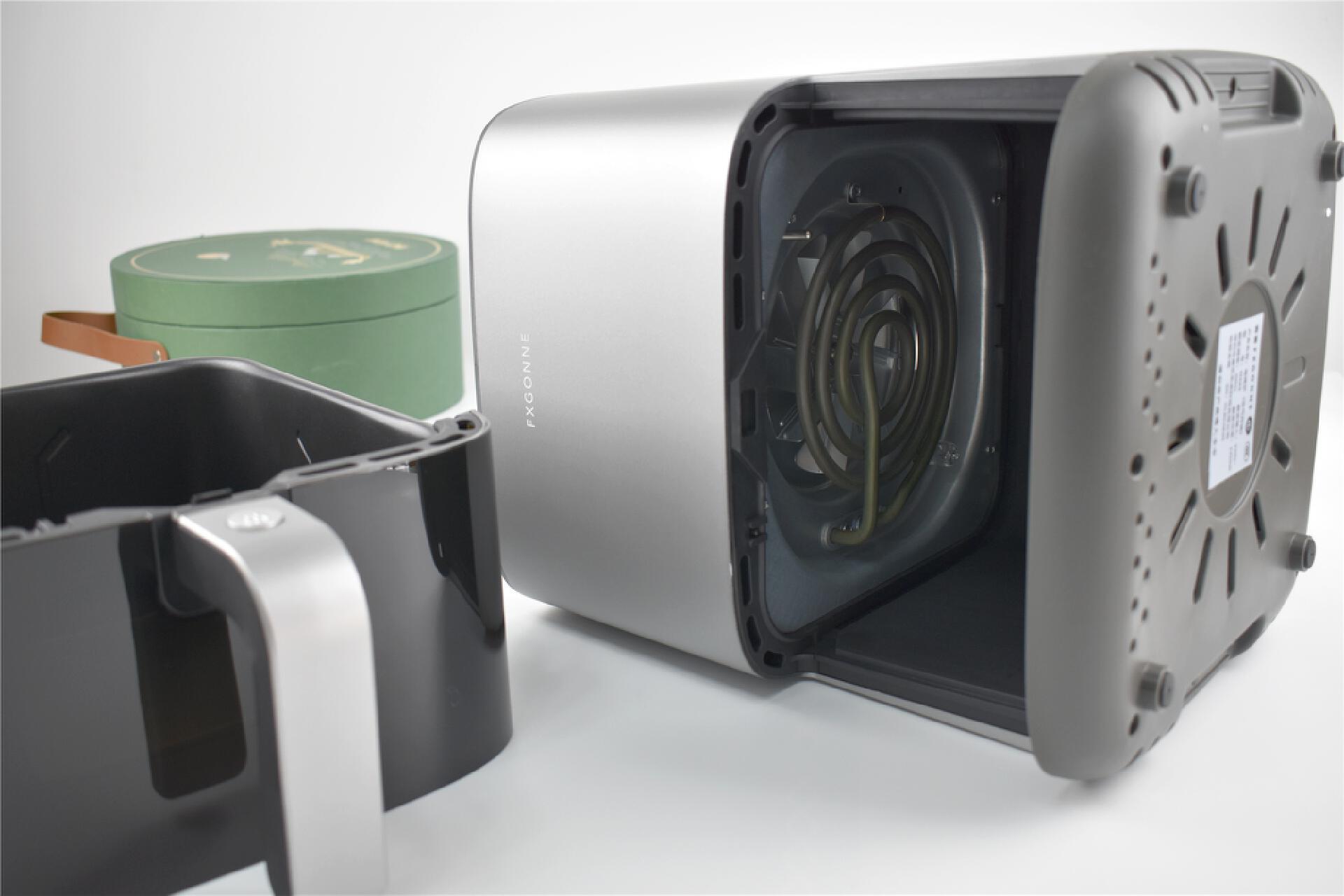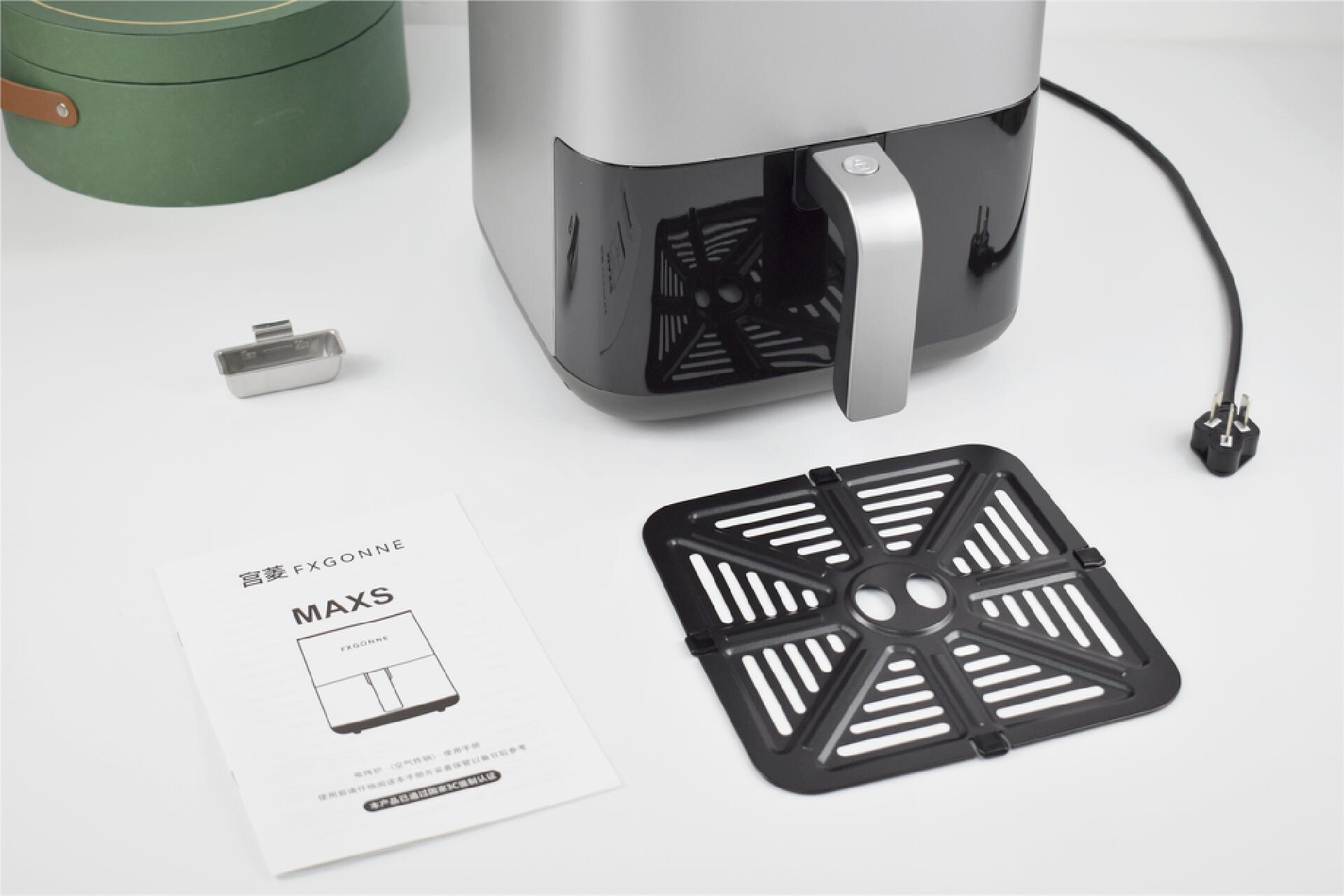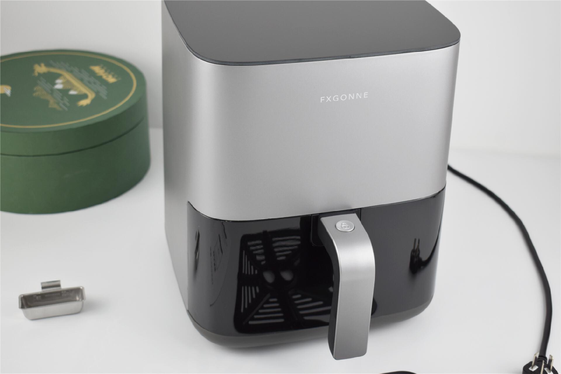 市面上的空气炸锅外形主要有圆柱形和方形两种,前者更为常见,而宫菱Fxgonne则是选择了后者,相较于圆柱形锅体,方形在摆放时更节省空间,配合亮灰色喷漆让产品显得高端大气上档次。