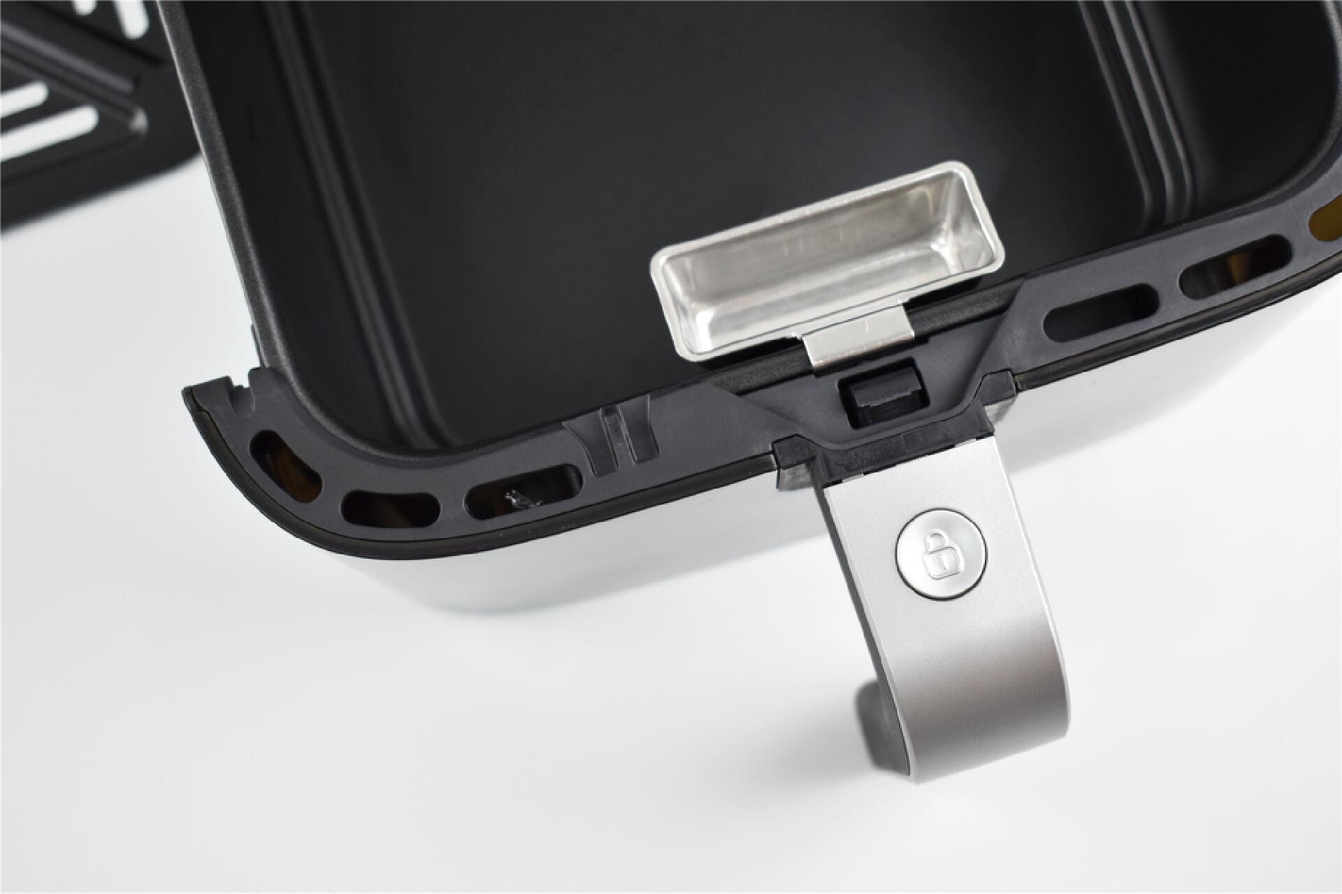 烤蓝还加有儿童锁设计,在握把顶部有一个按压式的锁死结构,按下后才能抽出烤蓝,这样就能防止机器工作时家里的孩子擅自打开炸锅烫伤自己,守护孩子的健康安全;当然,按压锁扣主要防范的是低龄儿童,毕竟大一些的孩子已经有安全意识了,就算知道怎么打开也不会去触碰高温状态的炸蓝。
