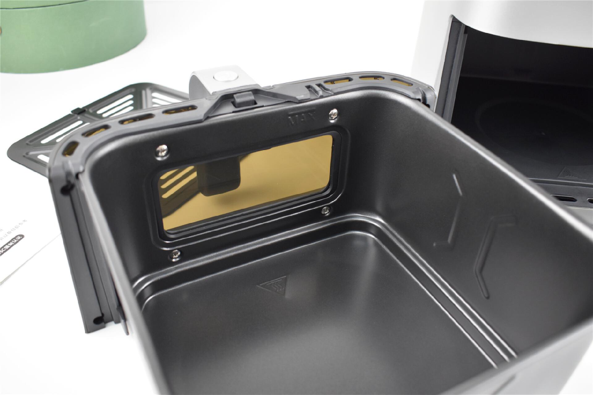 市面上的同类产品,大多是没有可视窗口的,想要确保食材不被烤糊,只能隔段时间打开炸锅确认,不仅会导致锅内热量降低,还容易烫伤;并且宫菱Fxgonne还增加了一道安全措施,当炸蓝被拉出时锅体会自动断电,从而避免触电风险。