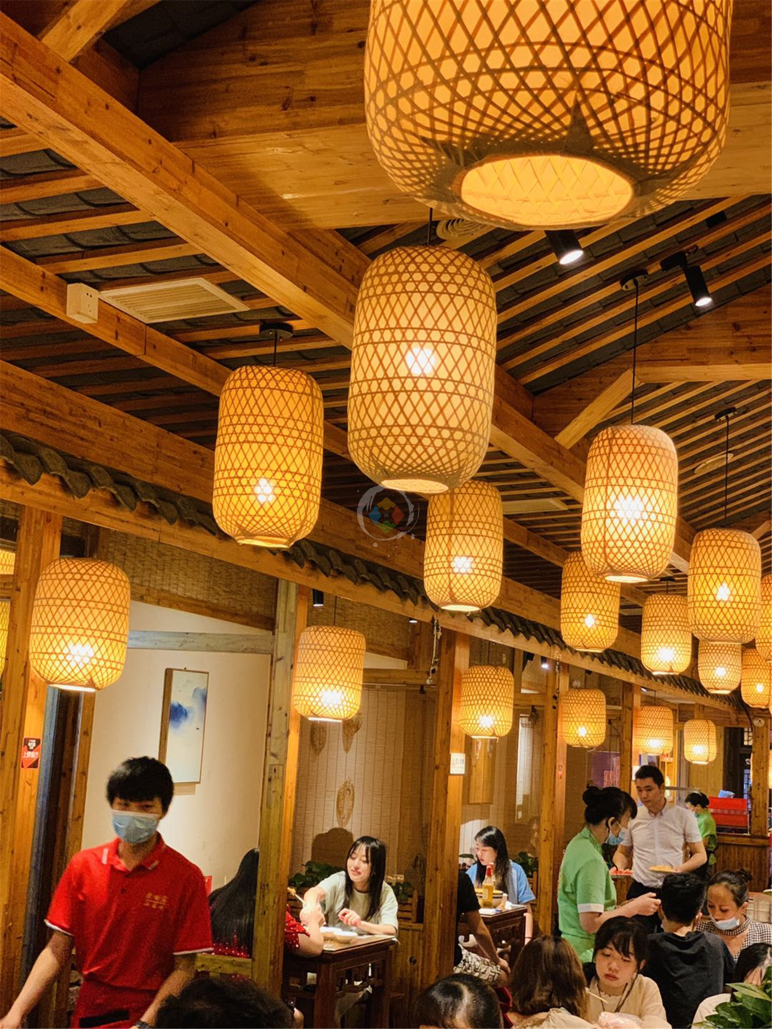 老甘家的店铺装修走的是重庆传统江湖菜的风格,以木质结构为主,在室内搭建了一个大型的院落,搭配上油纸和竹篾编制而成的灯笼,特别有感觉。