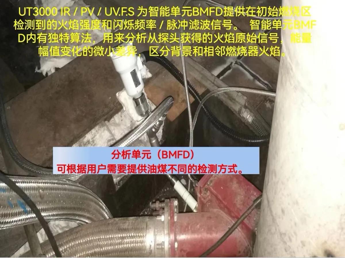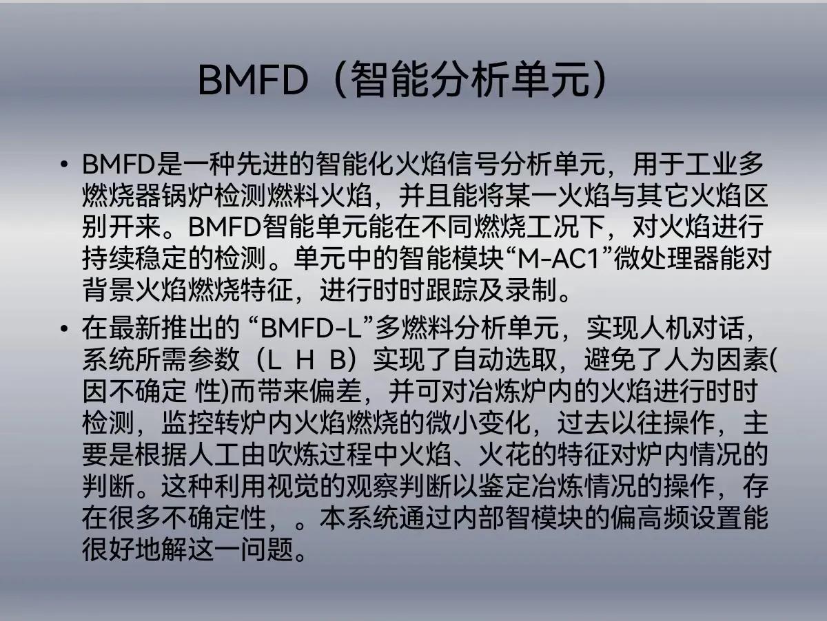 在最新推出的 “BMFD”多燃料分析单元,实现人机对话,系统所需参数(L H B)实现了自动选取,避免了人为因素(因不确定 性)而带来偏差,并可对火焰熄灭时,出现的其它火焰的存在,进行独特的物理阻断,使之系统自动识别功能更加可靠,从而提高了锅炉的灭火保护等级,使燃煤机组的工业锅炉的安全性得到进一步加强。