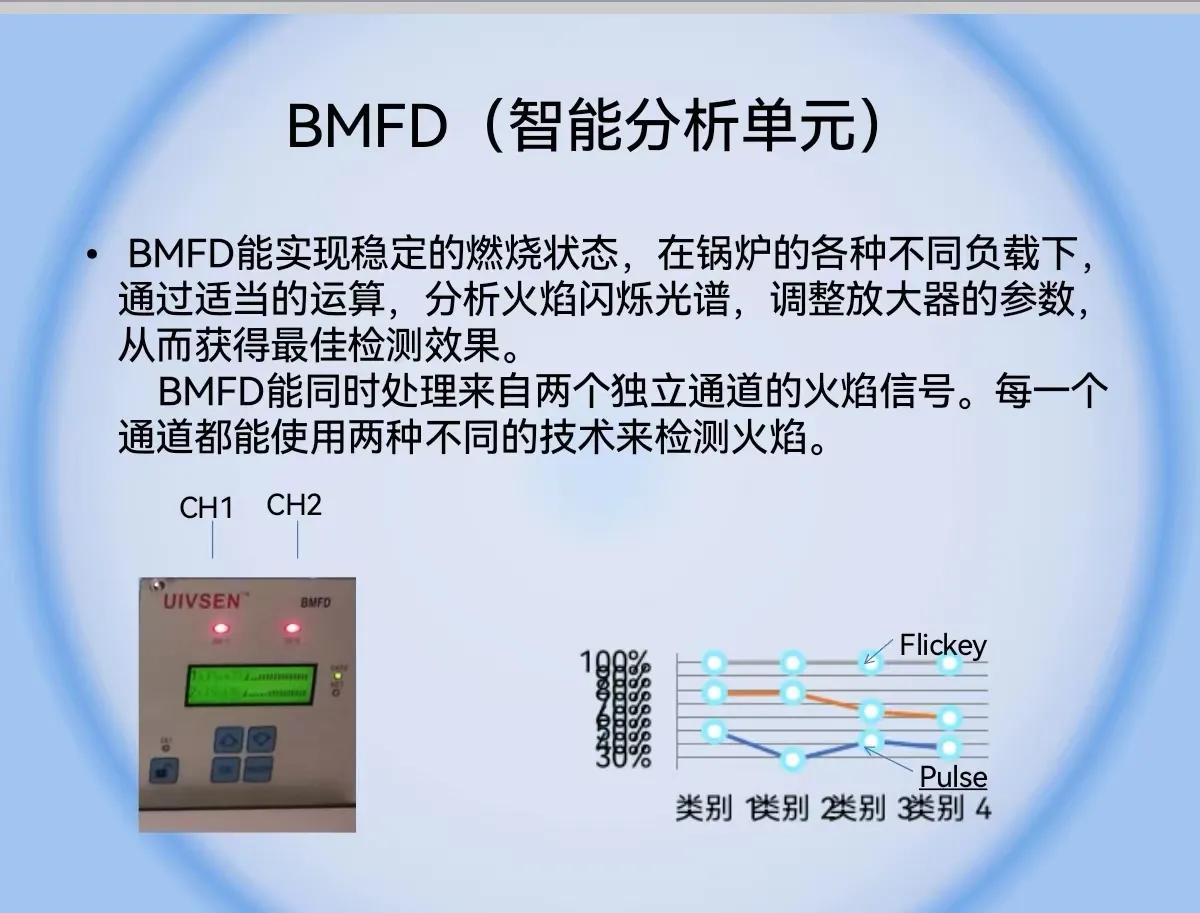 BMFD是一种先进的智能化火焰信号分析单元,用于工业多燃烧器锅炉检测燃料火焰,并且能将某一火焰与其它火焰区别开来。BMFD智能单元能在不同燃烧工况下,对火焰进行持续稳定的检测。单元中的智能模块“M-AC1”微处理器能对背景火焰燃烧特征,进行时时跟踪及录制。