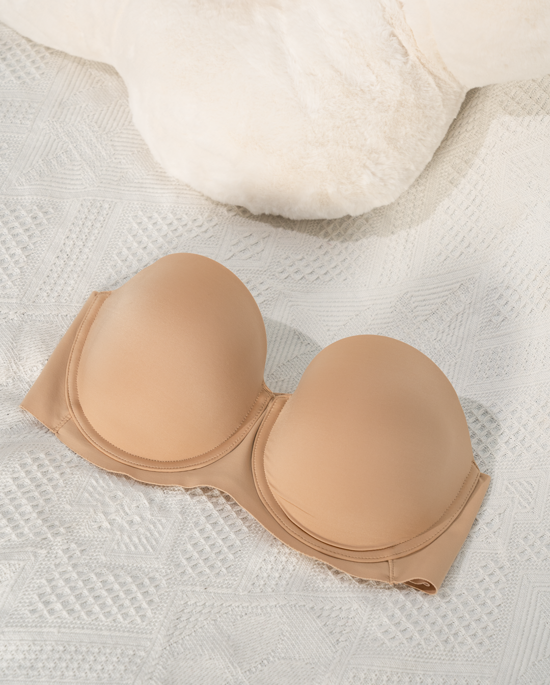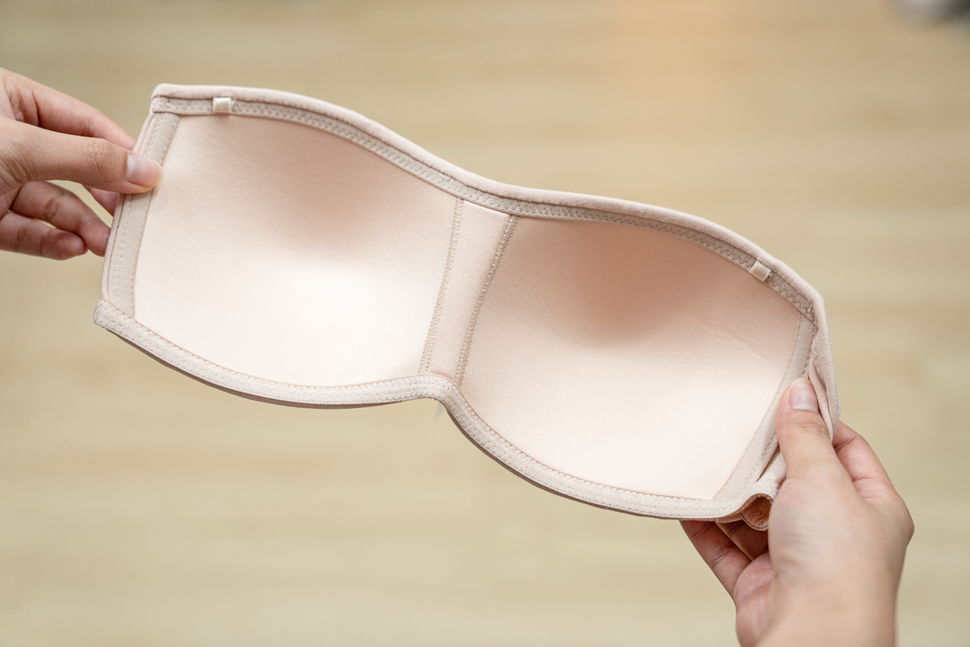 因为无肩带内衣很容易往下掉,所以一定要有防滑设计,阻止内衣下坠。
