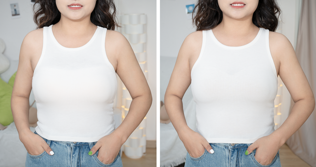 同时,侧面的硅胶条还可以塑形,让胸部不往两边跑。这里找了一件没有硅胶条支撑的内衣,对比一下就能看得出效果。
