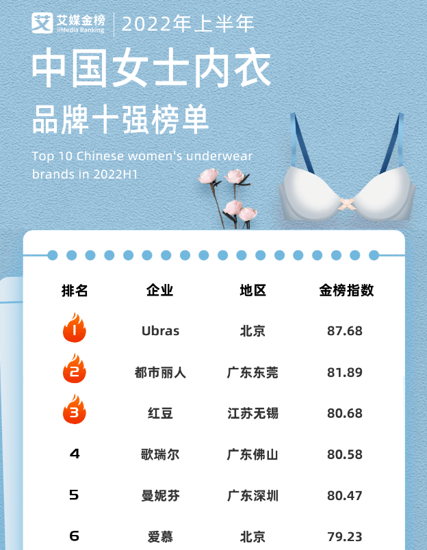 根据艾美金榜最新发布的今年上半年中国女士内衣品牌十强榜单,前10名国货品牌占了9位,爱慕、古今、恒源祥、蕉内分别位列榜单第6、7、8、10位,排在榜单第4-5位的是歌瑞尔、曼妮芬,均为广东品牌。