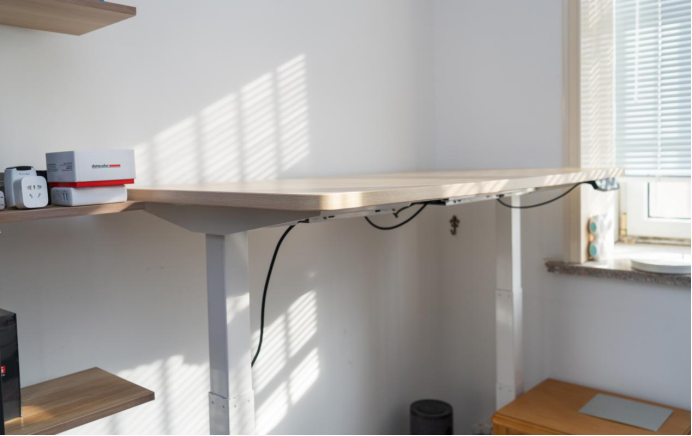 这款升降控制器可以自己定义三个高度实现一键切换,再就是还可以设置坐站交替闹钟,控制器可以放在左侧也可以放在右侧,已经预置好了螺丝孔了。桌面建议大家尽可能的要长一点、宽一点的,我这款是1400*700的,颜色是原木色,宽一点可以放更多东西。