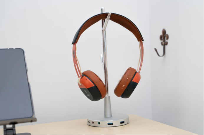 这款耳机支架在我拍耳机时出镜率超级高,它造型像一根树杈,在是个耳机支架的同时,还其巧妙地把底座与USB-C HUB功能集合到一起,拓展出了2个USB 3.0的 Type-A和Type-C接口,支持TYPE-C PD反向供电的功能;2个3.5mm AUX接口通过内置声卡可以用来连接耳麦,现在很多电脑接口精减到只有一个Type-C了,用这款耳机支架就可以很方便的拓展出更多接口了。