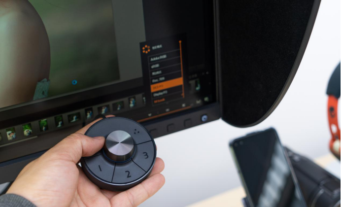 遮光罩内里是黑色的植绒,吸光线不错,修图时可以减少环境光影响,而且还能提升修图环境的专业度,还有个隐藏功能,就是在办公室使用能防窥屏。配备的OSD控制器可以很方便的实现对显示器常用功能的一键切换。