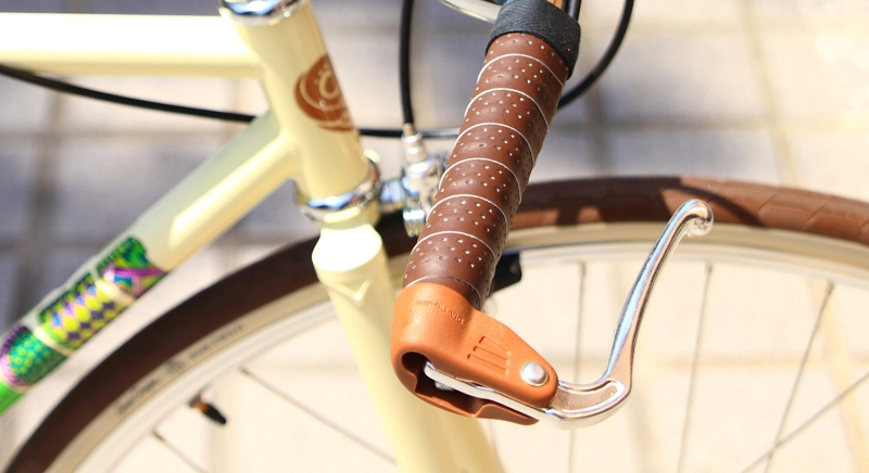 该车的原配刹把用的是Dia-Compe品牌的车把内壁胀芯固定式复古刹把,安装在车把两端,刹把的杠杆活动方向和绝大多数自行车相反,这便使得它虽然好看,但对于绝大多数人的刹车习惯来说,却有些别扭——刹车时的发力用指会多集中于食指和无名指,且需要除大拇指之外的四只手指共同操作,大大降低了在紧急制动时,骑车人对于车把的操控性。对于北京这种车流量极大,路况繁杂的城市来说,并不是一个安全的选择。