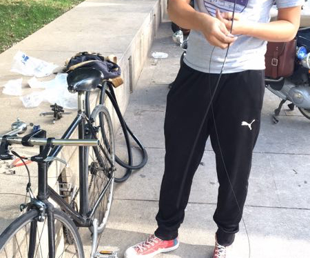 于是,一个工作日的午休时间,我拿着工具,老徐推着车,在我公司楼下的花园里开始了本次的零件更换工作。