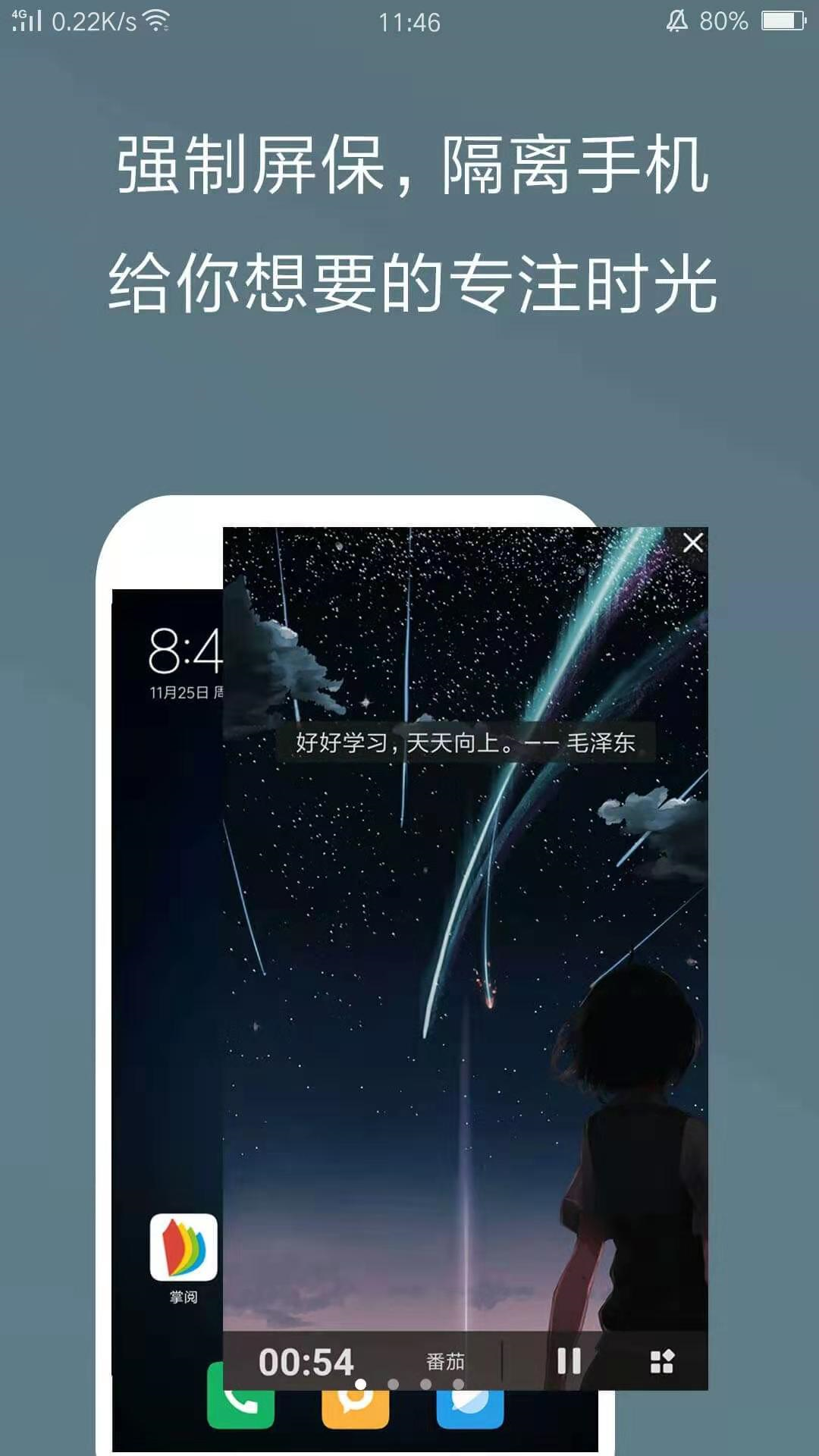 玩手机的时间超过预定时间后,手机自动锁屏,强制休息一段时间。