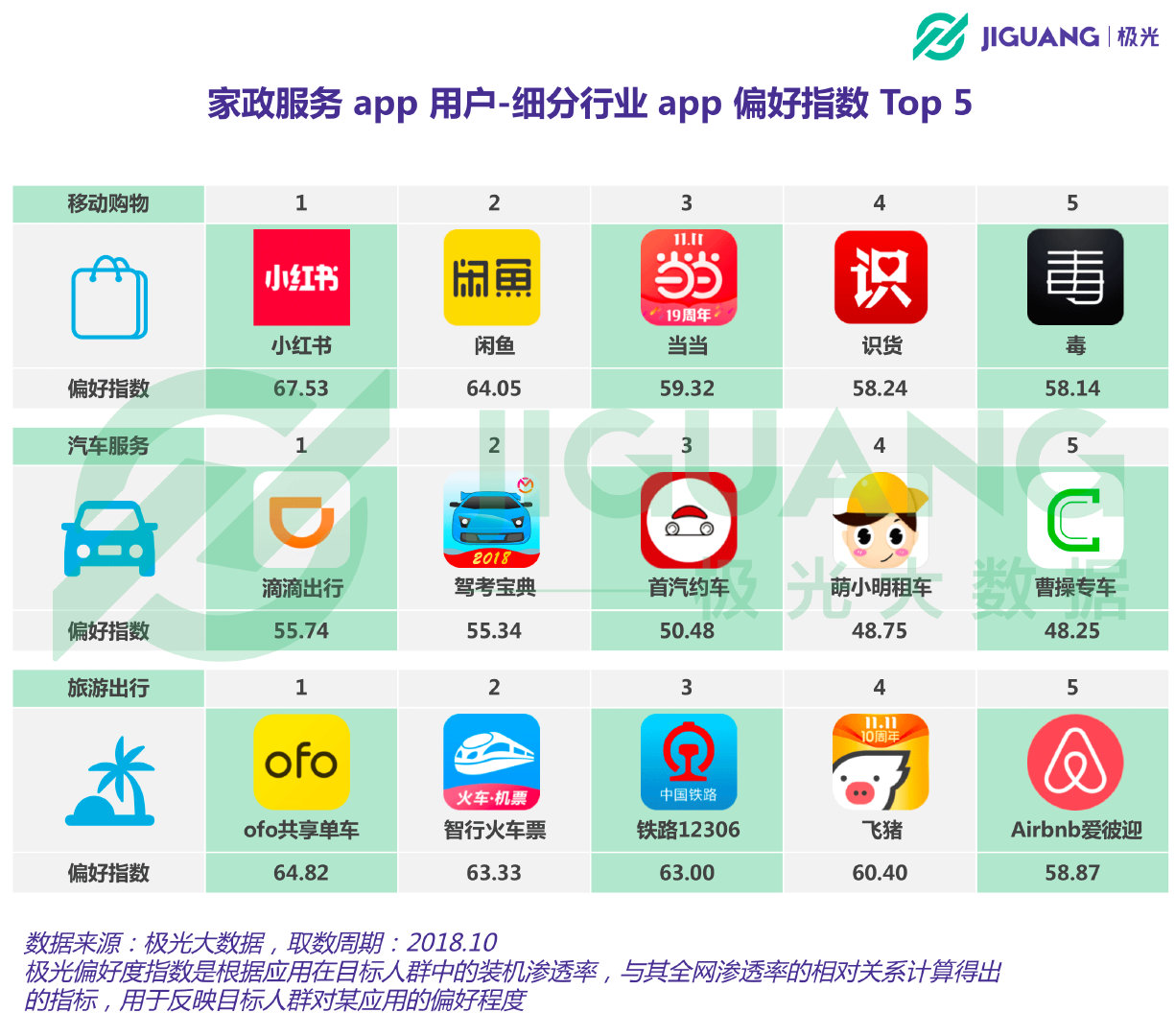 在移动购物类app中,家政服务app用户最偏好小红书、闲鱼和当当。在汽车服务领域,最受目标人群偏好的是滴滴出行、驾考宝典和首汽约车。而在旅游出行领域,目标群体最偏好ofo共享单车、智行火车票和铁路12306。