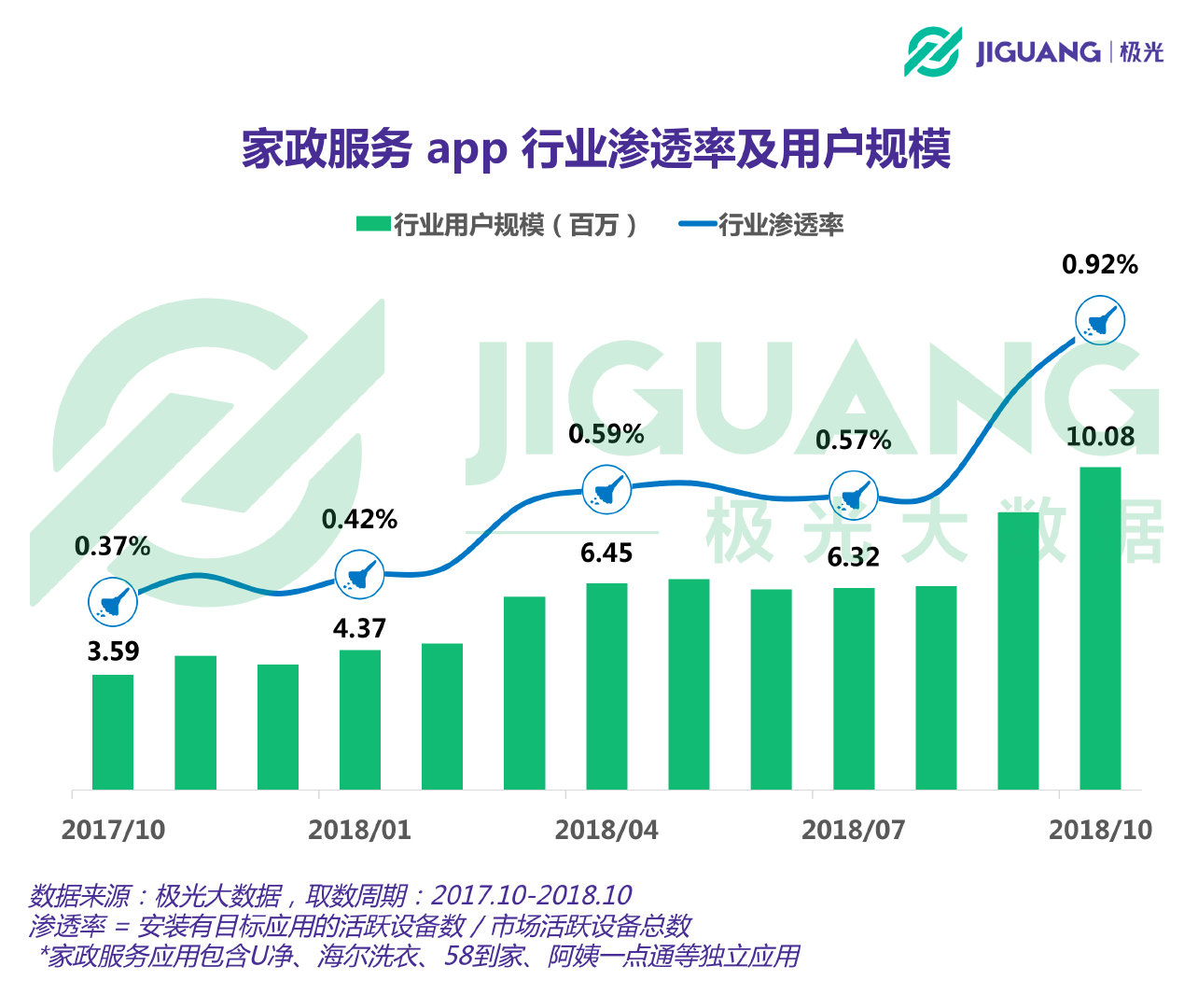 极光大数据的统计结果显示,截至今年10月份,家政服务垂直app的用户规模达到1,008万,较去年同期增长了180.8%。尽管用户规模增长明显,但家政服务app的行业整体渗透率目前仍处于较低水平,10月行业渗透率为0.92%。