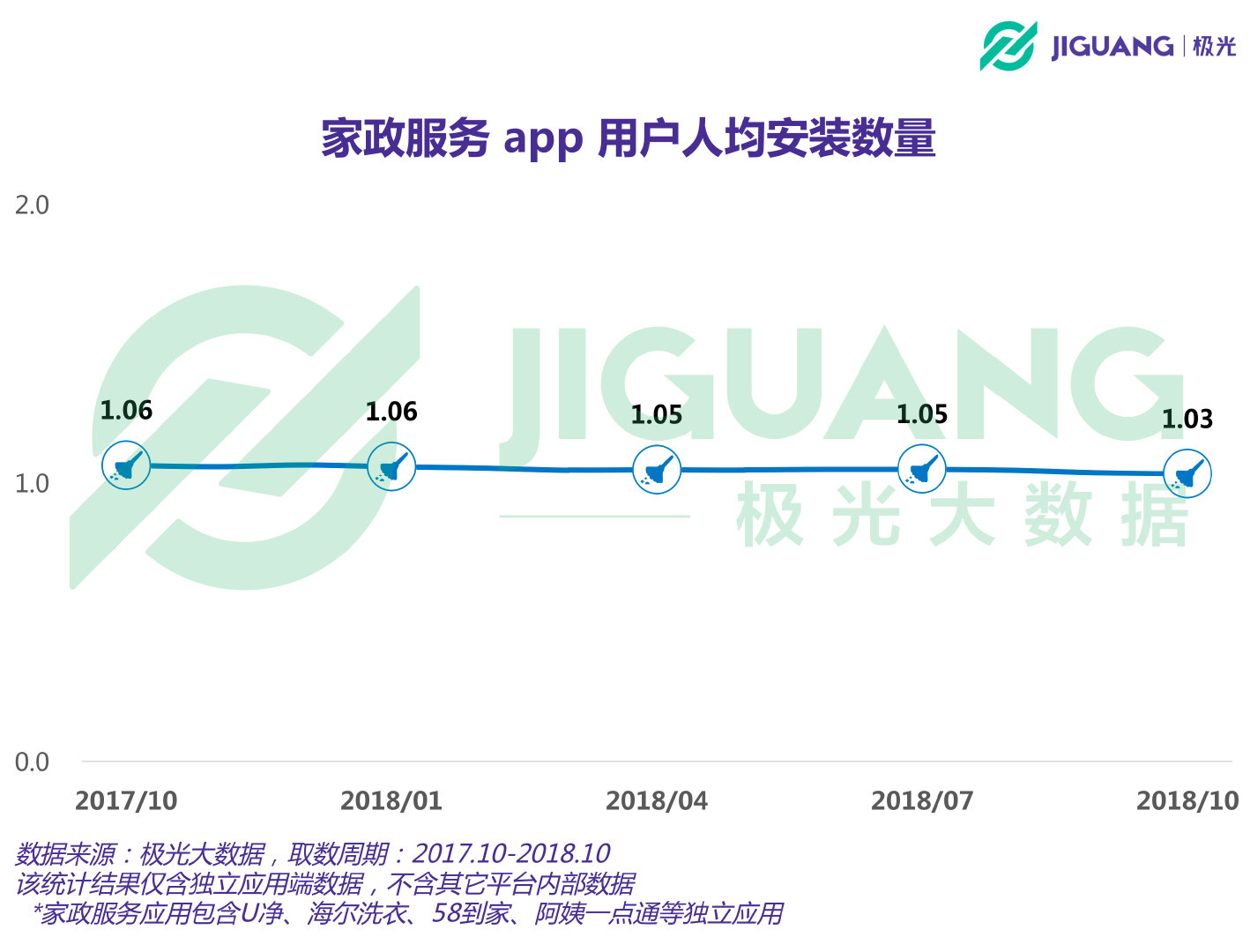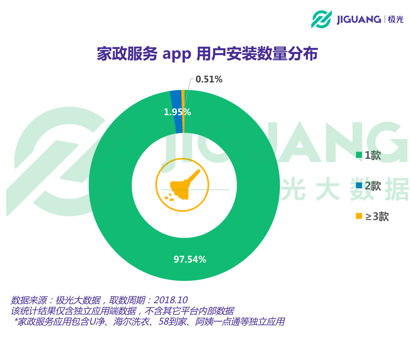 根据极光大数据的统计结果,仅在设备上安装1款家政服务app的用户占比高达97.54%。安装数量为2款的用户占比为1.95%,达到3款及以上的用户占比仅为0.51%。尽管部分家政服务类app甚至会专注于洗衣、维修这些垂直领域,但对于绝大多数用户而言,1款app似乎已经足以满足日常使用需求。