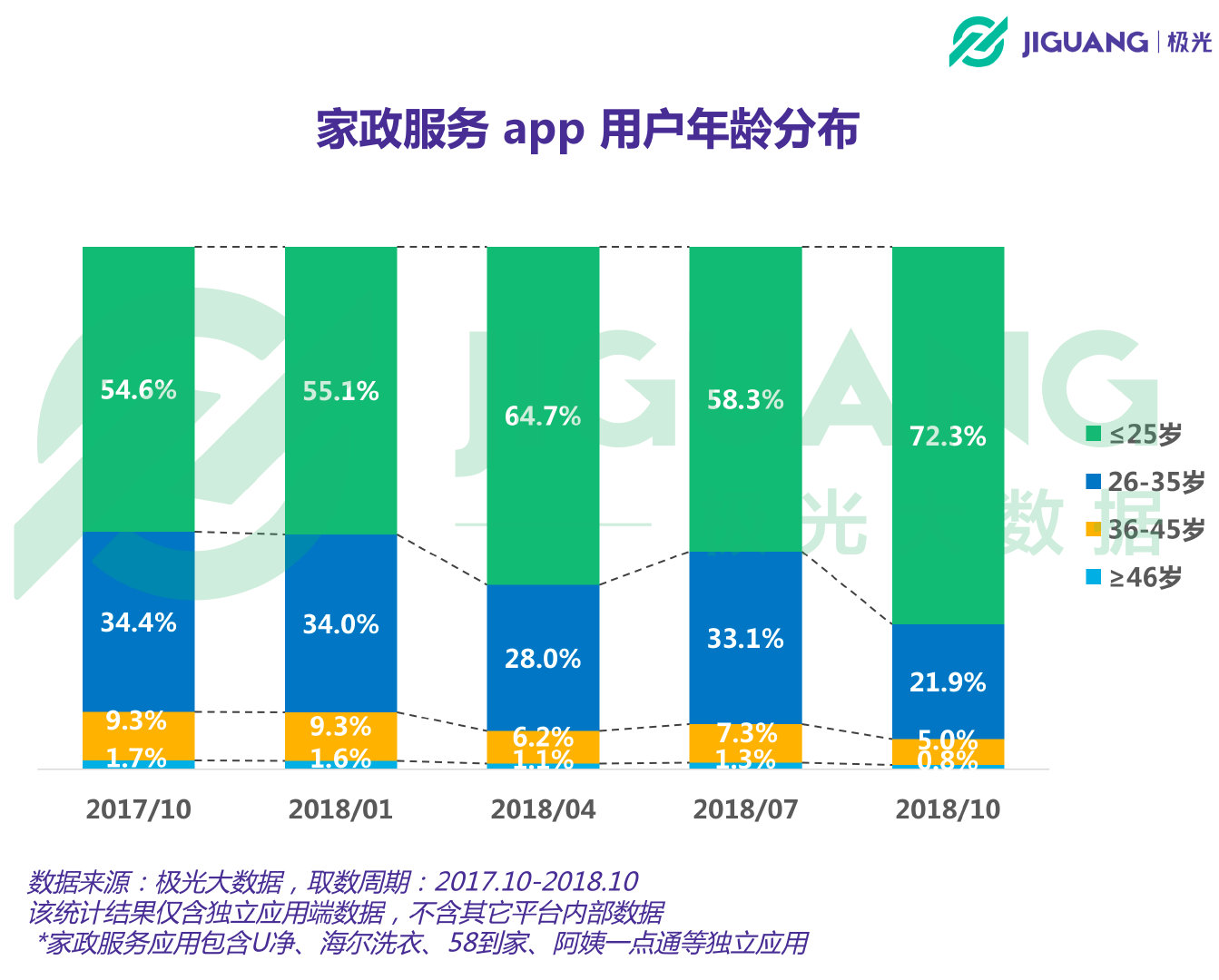 在家政服务app中,25岁及以下用户的占比在过去一年始终达到一半以上。截至今年10月份,25岁及以下用户的占比进一步增长至72.3%,而26-35岁用户的占比则有所减少,所占比例为21.9%。