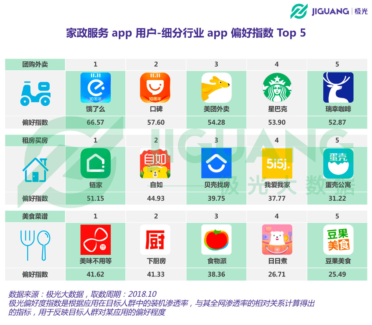 在团购外卖领域,家政服务app用户最偏好饿了么、口碑和美团外卖。在租房买房app中,最受家政服务app用户偏好的是链家、自如和贝壳找房。而在美食菜谱领域,家政服务app用户最偏好美味不用等、下厨房和食物派。