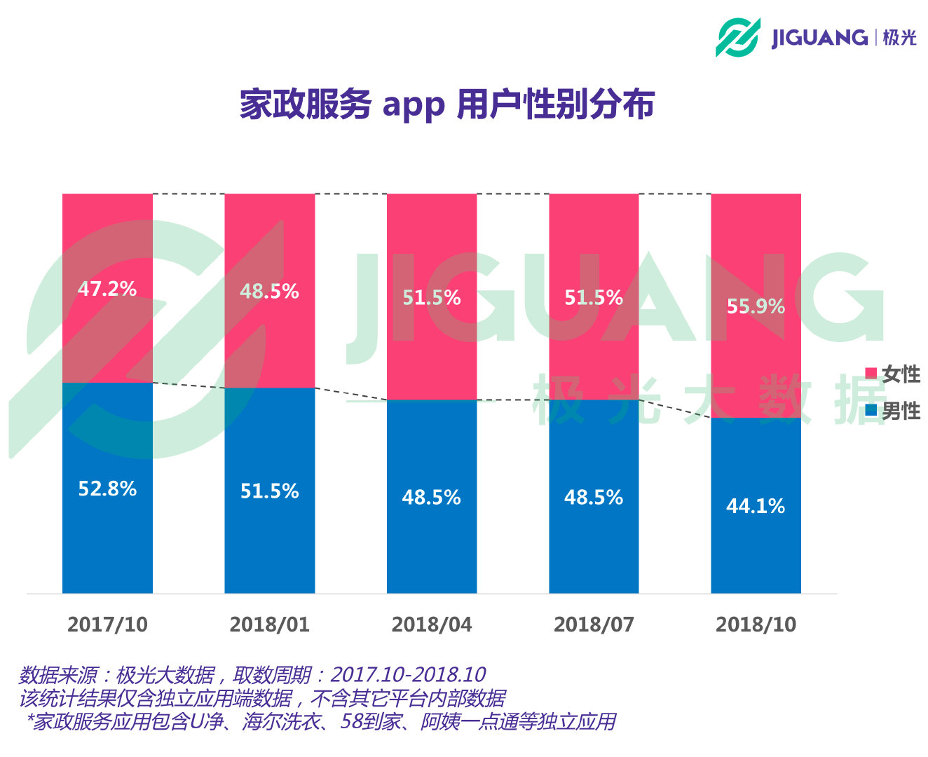 根据极光大数据的统计结果,过去一年家政服务app中女性用户占比的增长趋势非常明显。截至今年10月份,家政服务app中女性用户的占比为55.9%,较去年同期增加8.7%。