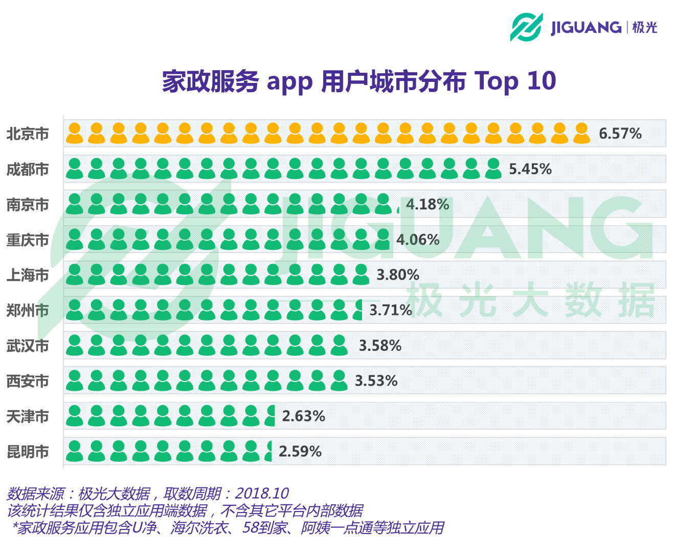 更新至10月的用户城市分布结果显示,家政服务app用户占比最高的城市是北京,用户占比为6.57%,成都则以5.45%的用户占比名列第二。随后是南京和重庆,用户占比分别为4.18%和4.06%。其余城市的用户占比均不足4%。