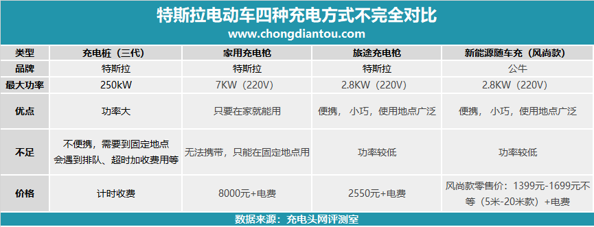 目前特斯拉官方为特斯拉提供了三种不同的充电方式,充电桩、家用新能源随车充以及旅途新能源随车充,结合本篇内容介绍的公牛新能源随车充进行了汇总对比。