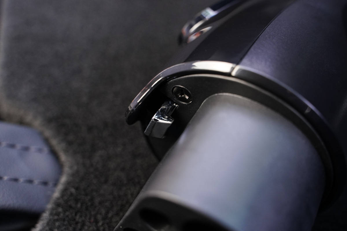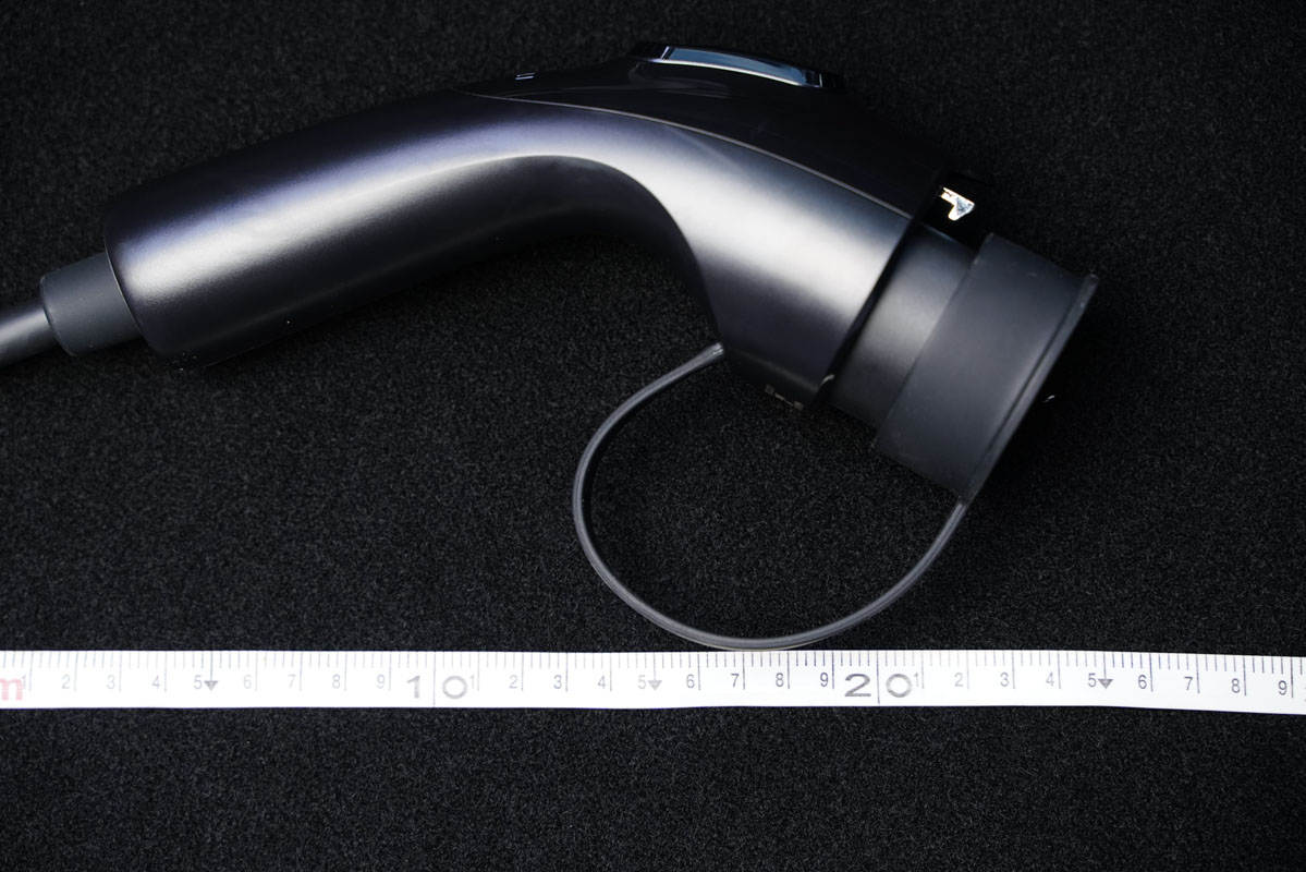 新能源随车充的枪头部分采用了人体工学的外观设计,只需要手持枪柄的位置,然后按下顶部的挂钩按键。