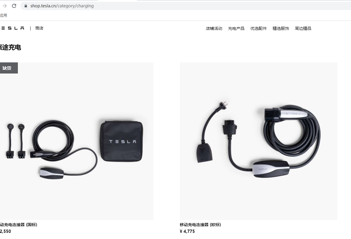 旅途充电方面特斯拉官网提供了两种移动充电器,其中国标版本的显示为缺货状态,但我们细看价格,国标的旅途充电器为2550元,欧标的价格为4775元。