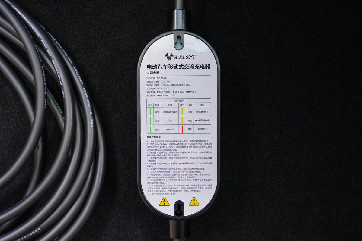 公牛新能源随车充整体分为连接电源的插头,充电控制盒以及连接汽车充电口的枪头部分。