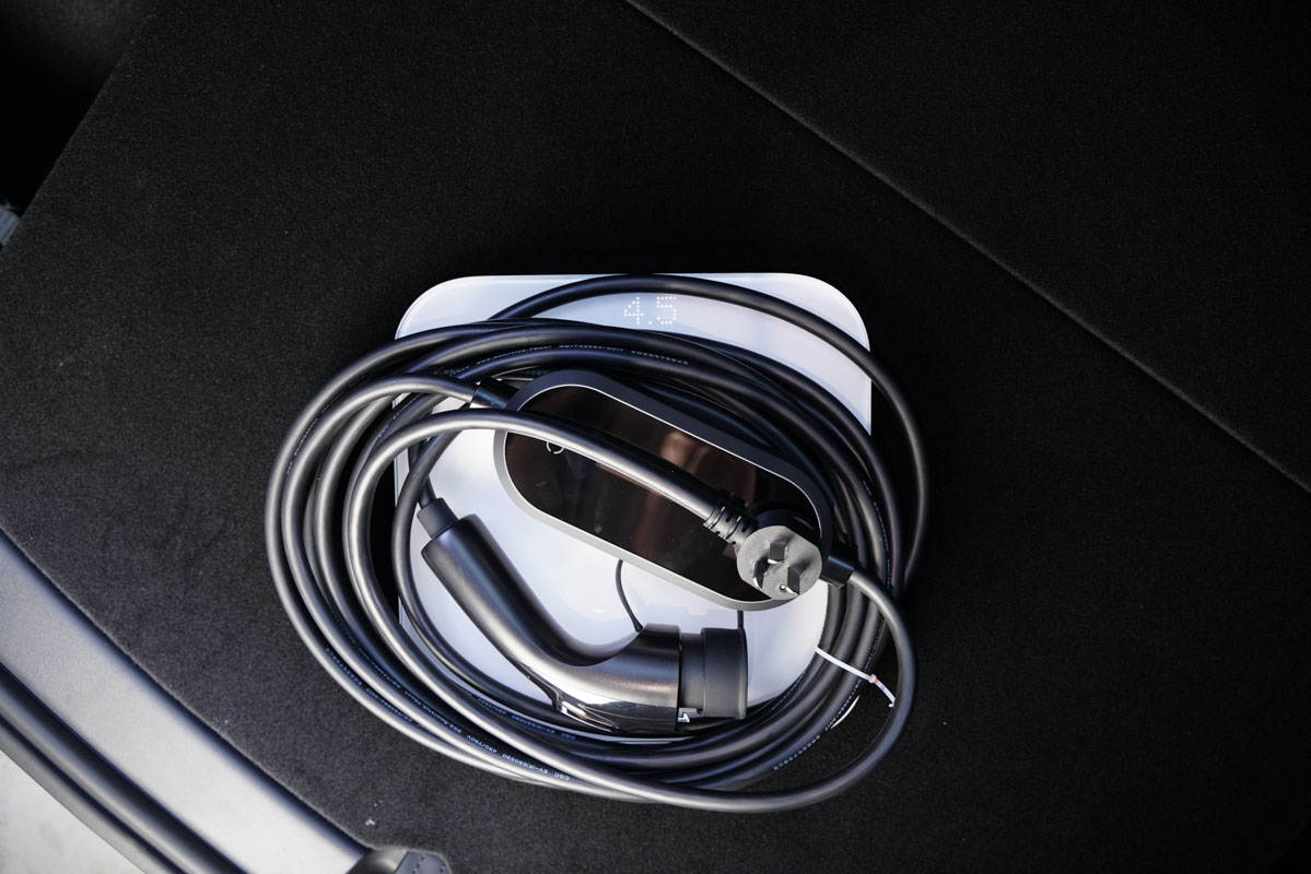 介绍完了新能源随车充部分,再来看这个大件儿吧。特斯拉Model Y配备了两种充电接口,左侧适用于便携式的小型汽车新能源随车充,而右侧的充电接口则适用于一些大电流的超级充电桩。