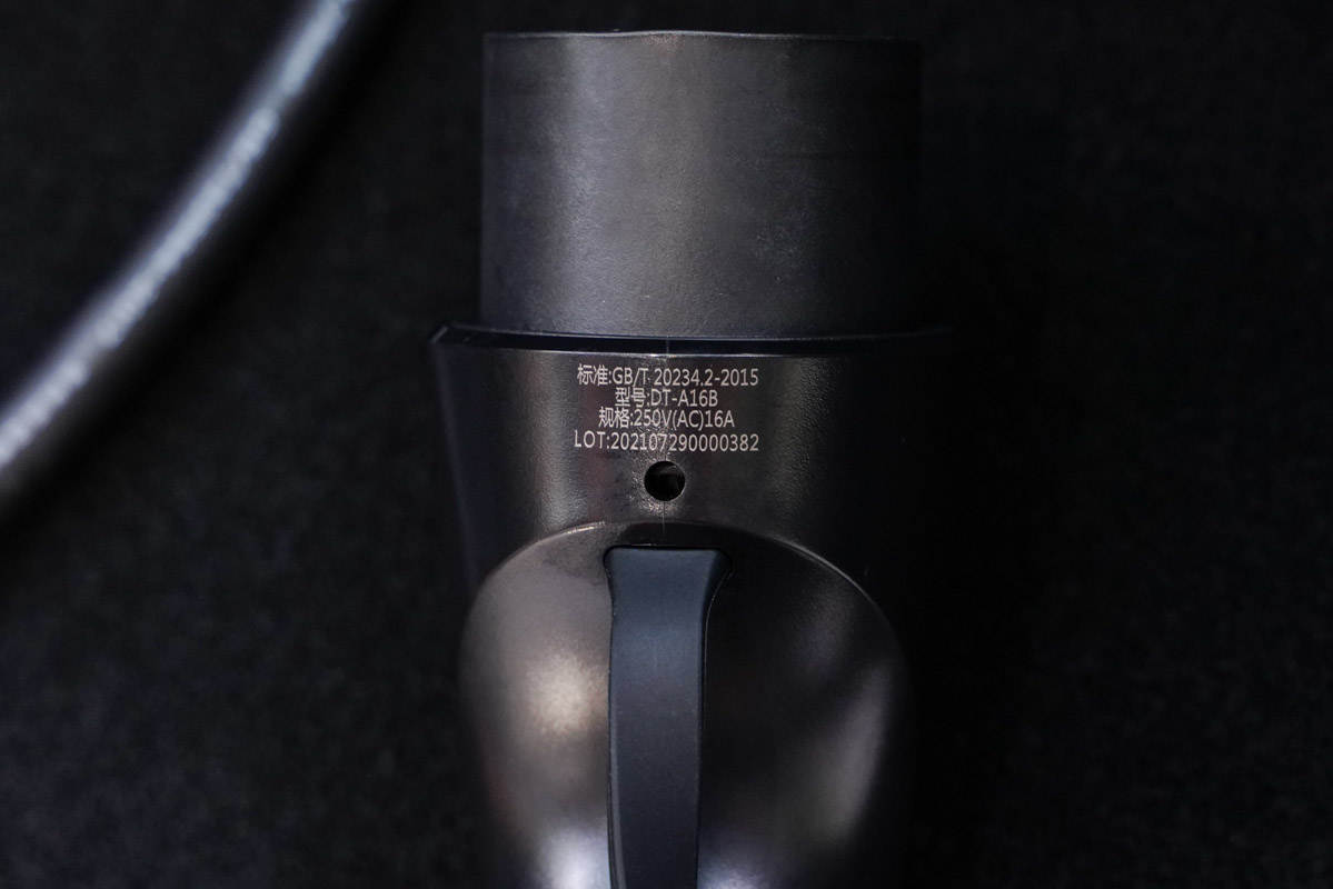 新能源随车充的16A插头连接到转接器部分,最后将组合连接到10A规格的插座用于充电,不过充电电流会限制在10A Max 。