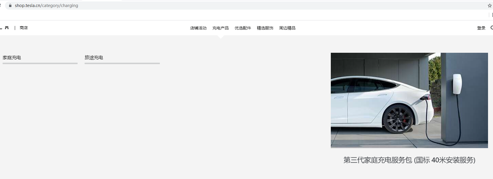 先来看一下目前新能源车的充电方式,这里以特斯拉为例,打开特斯拉的官网并选择充电产品界面。目前特斯拉汽车的充电方式主要分为充电桩充电、家庭充电和旅途充电三种。