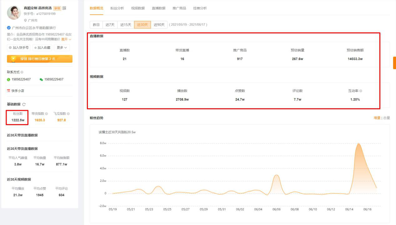 分析一个主播前,首先要了解该账号的一个大致情况,具体细分到粉丝数量、直播数据、视频发布频率、近期涨粉情况等等。