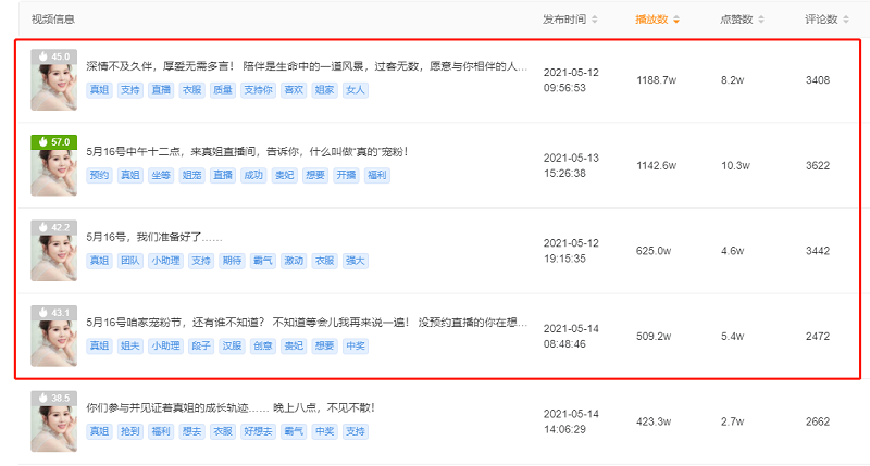 从真姐的视频数据来看,最热的一条是为5月16日“宠粉节”拍摄的感恩粉丝视频,视频中讲述了自己踏上直播路程的艰辛,以及身后强大粉丝的支持,在视频的最后还预告了16日宠粉节将以百万福利回馈粉丝。值得注意的是,播放量高的前4条视频全是为16日的宠粉节直播做的宣传预告。