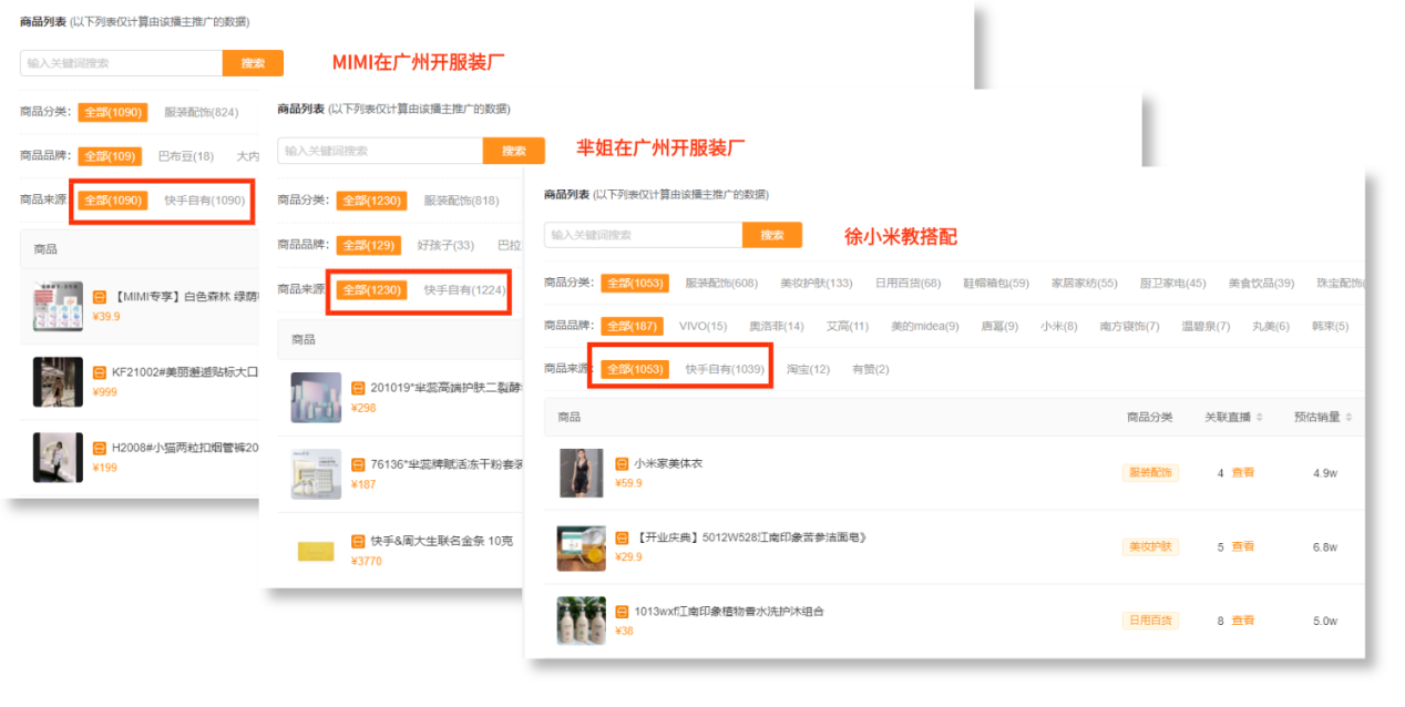 通过观察了带货成绩好的前几名服饰类主播,可以看到由于快手服饰类主播大多都是自有工厂,所以快手小店是他们主要的变现工具。