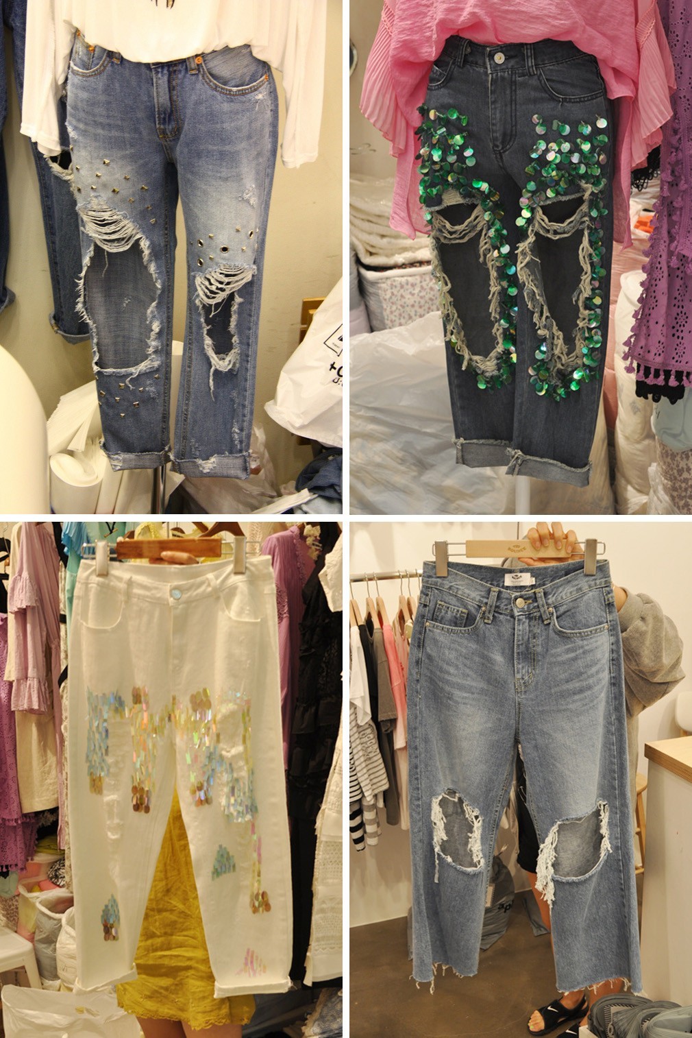 如果牛仔短裤你的店铺里已经有很多了的话,那么不妨考虑一下最近东大门市场中出现的新款牛仔裤,这款牛仔裤以大破洞和亮片装饰为主,清凉又时髦,而且最近的拿货量还特别的高呢!