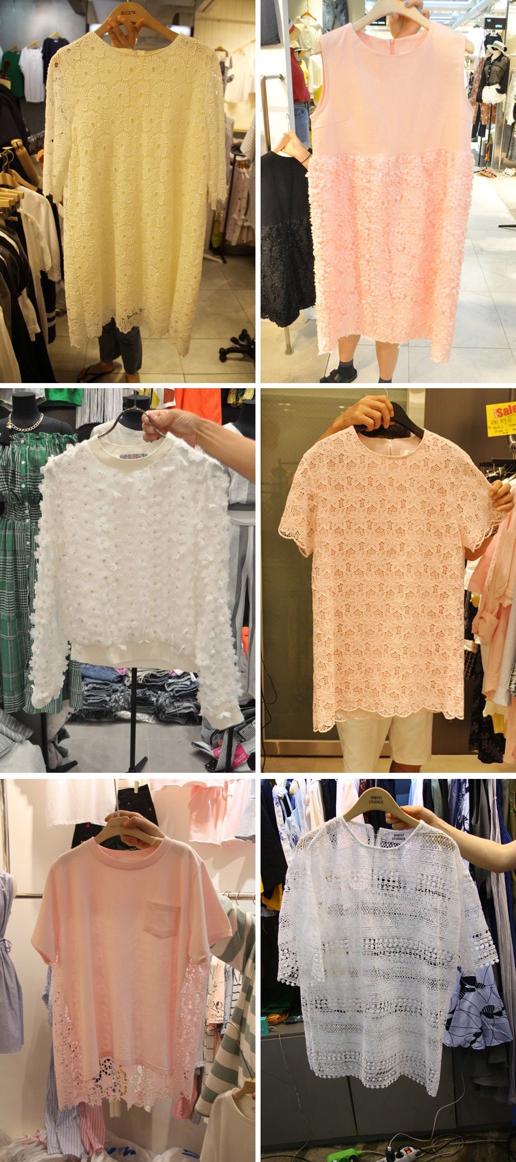 本周东大门市场有很多这样的服装,面料上多以蕾丝或者其它极富肌理感的为主,同时款式简单,极易搭配!