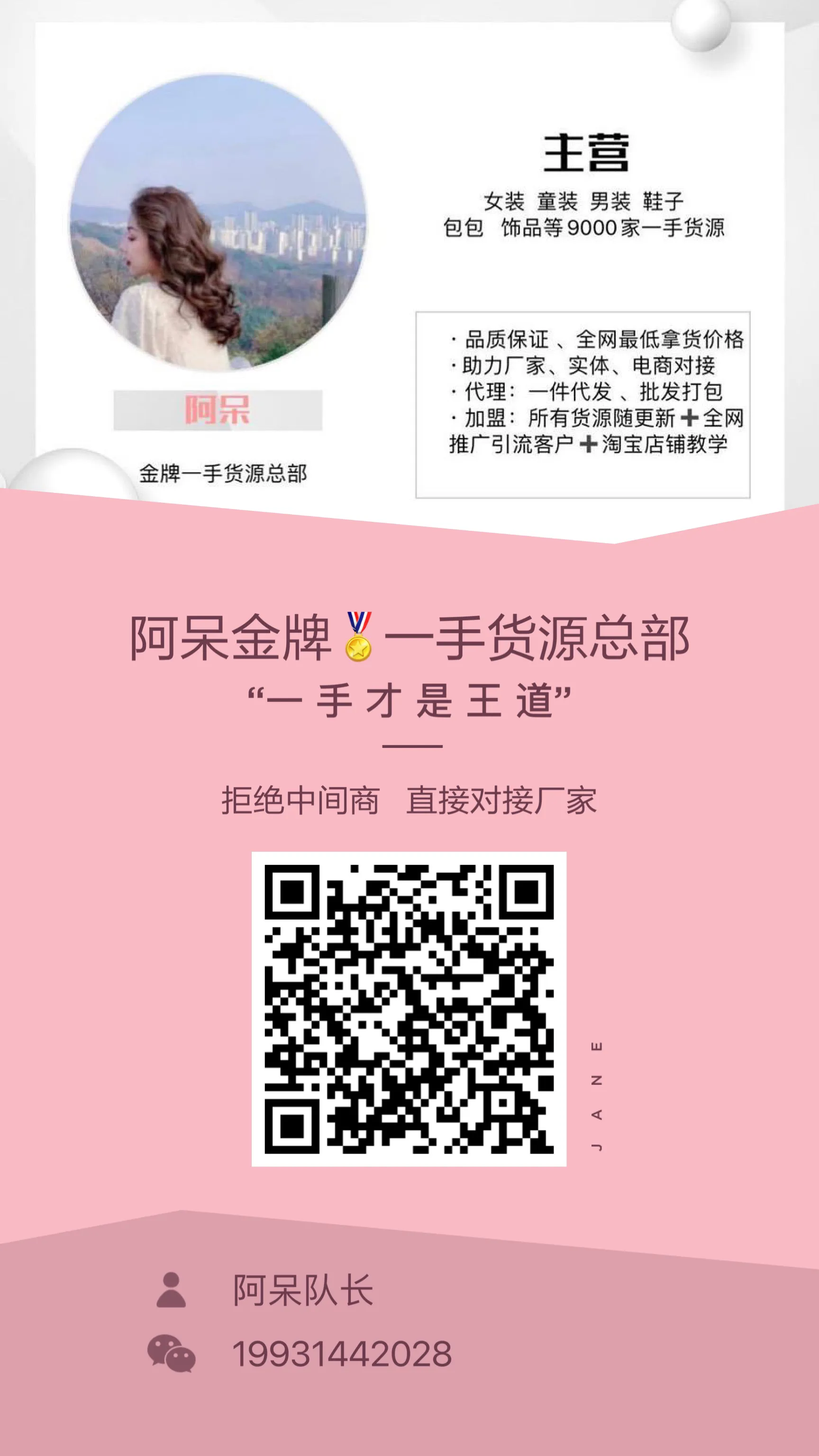 4.关于【招代理】就是如果你想卖服装、你可以在我朋友圈挑选你喜欢的货源,然后你就在我这里购买对应的货源号,货源号即厂家实体批发商的联系方式,都是以微信名片的形式发给你
