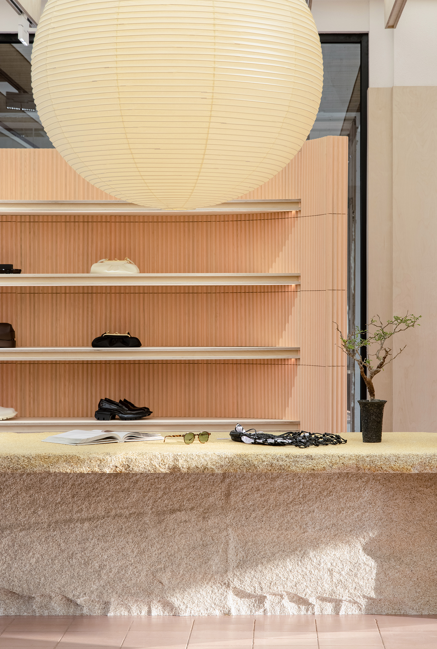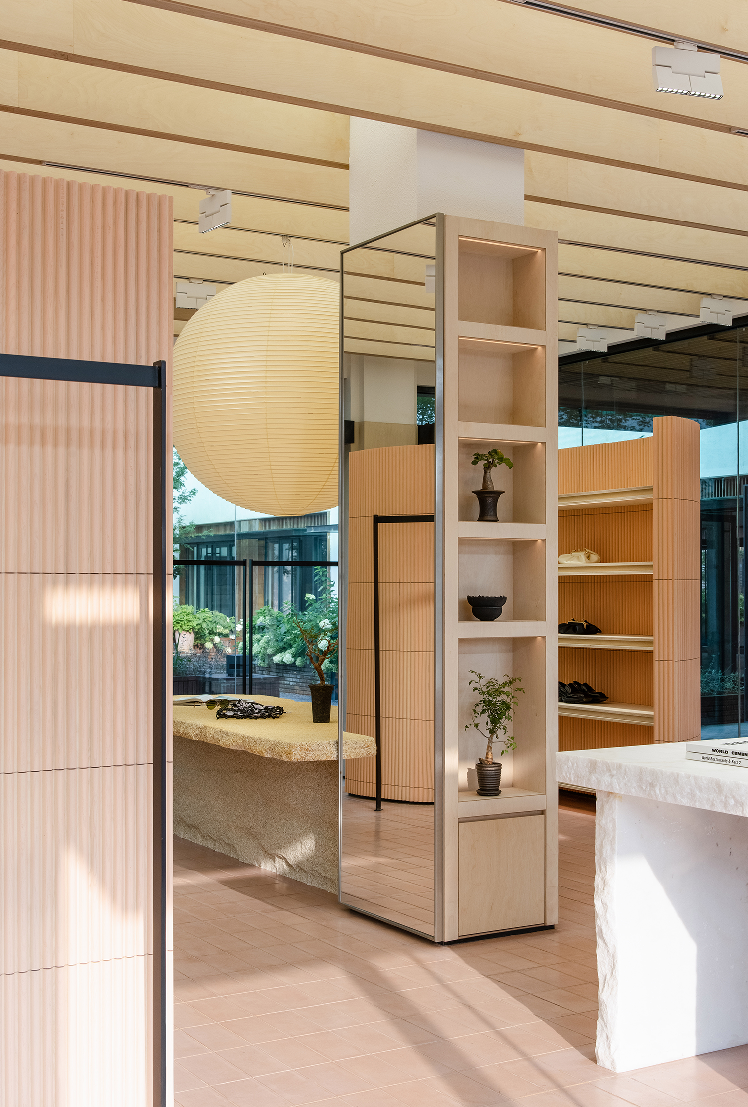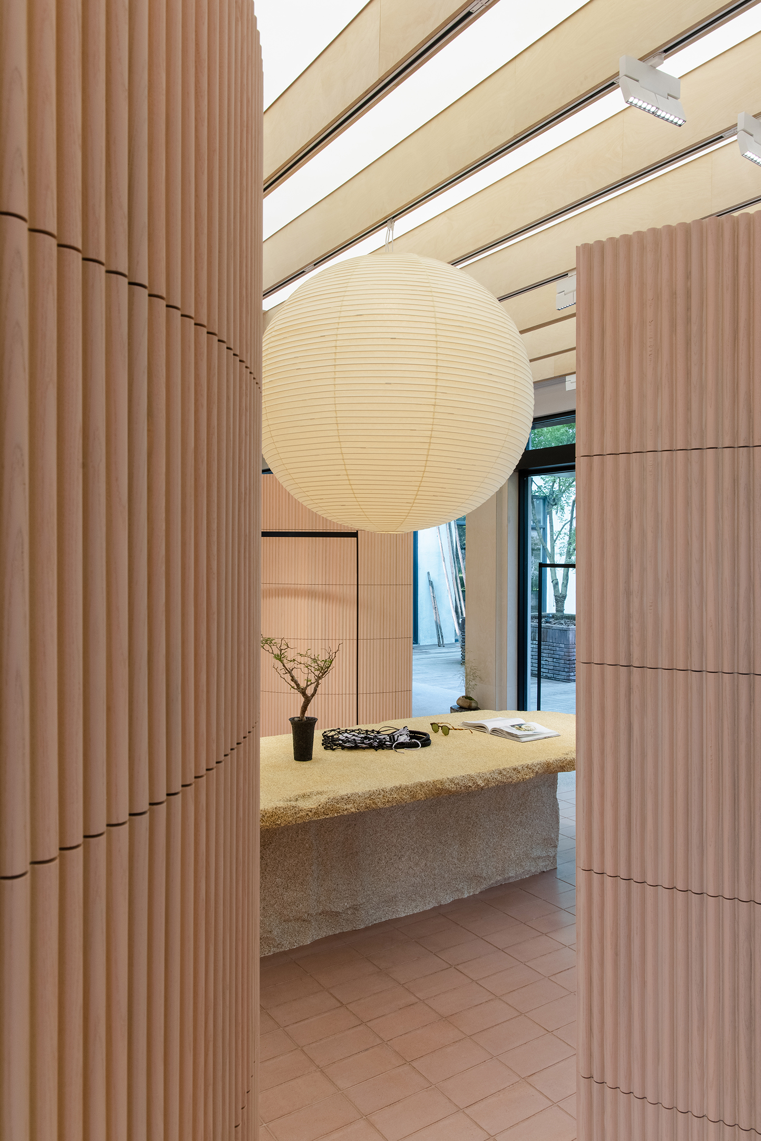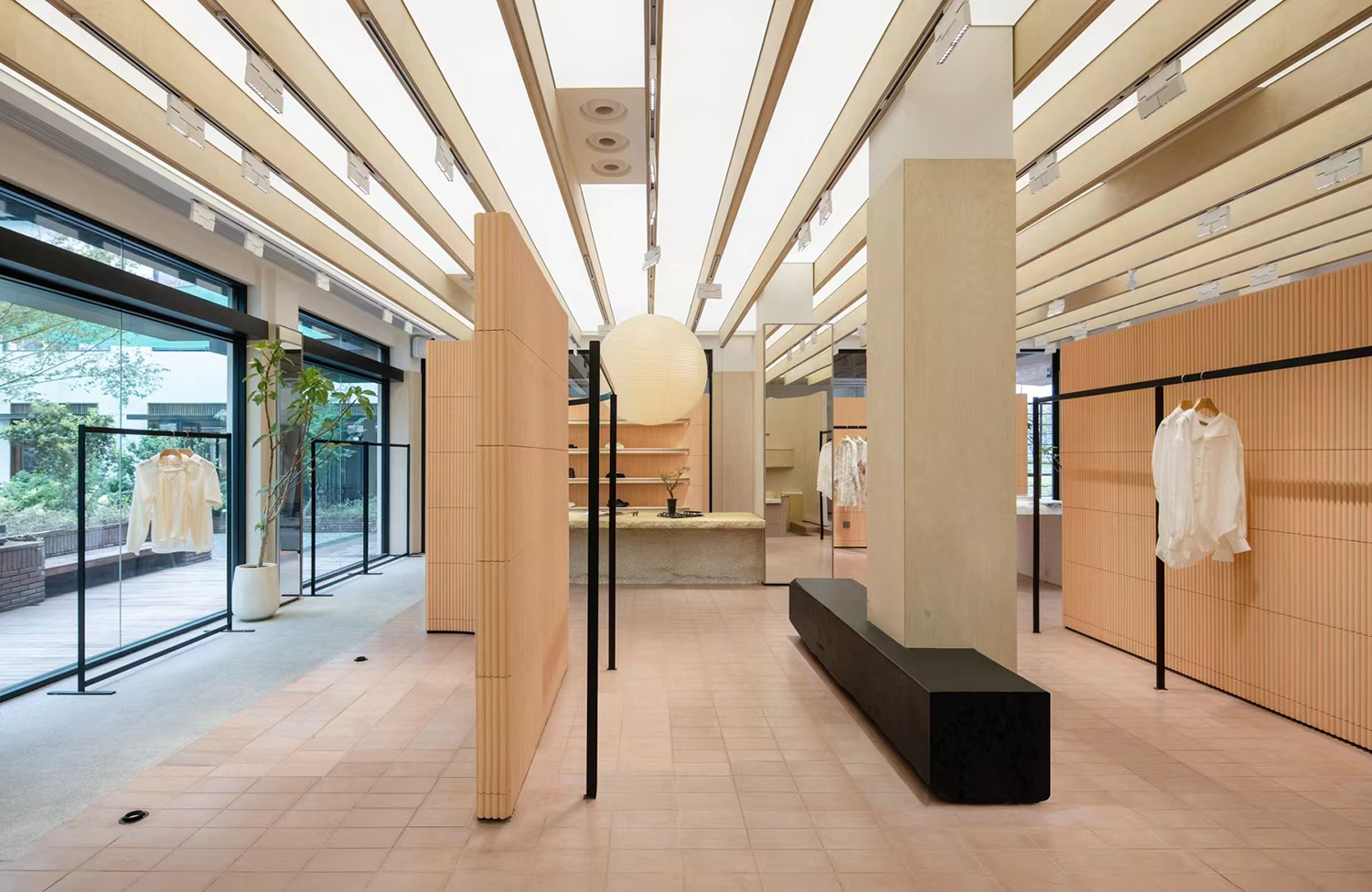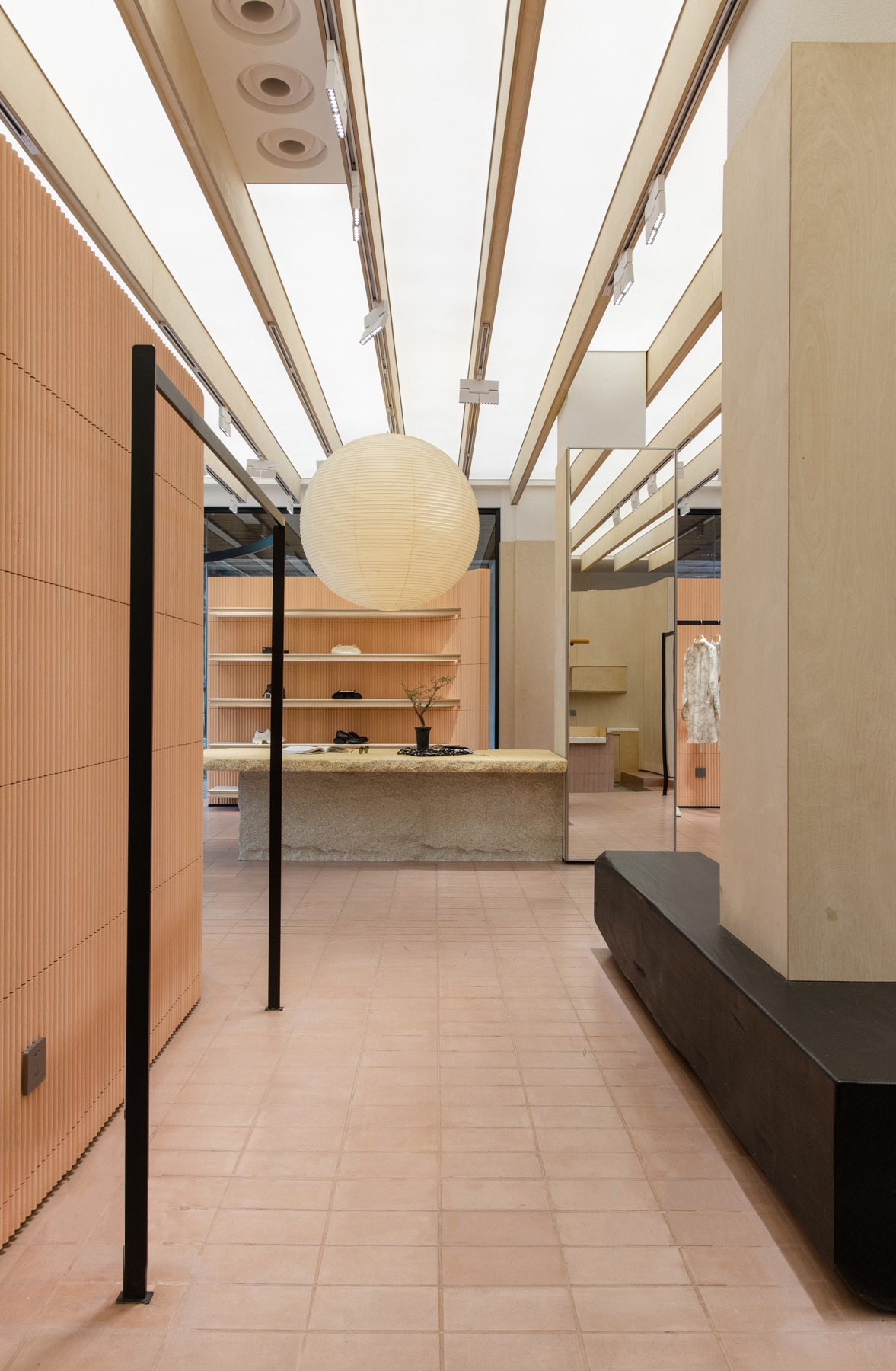 设计在材质的选择上结合整体品牌定调,中心展陈区域整体的抬高是设计师别具匠心的思考,地面橡皮色红砖拼出细腻的视觉,野口勇的经典纸灯希望能给人以自然之气与人文之气的结合,富有创意,关注细节,同时别致优雅,使空间整体视觉更具有丰富的变化性和包容性,为品牌未来运营提供了更多可能性。