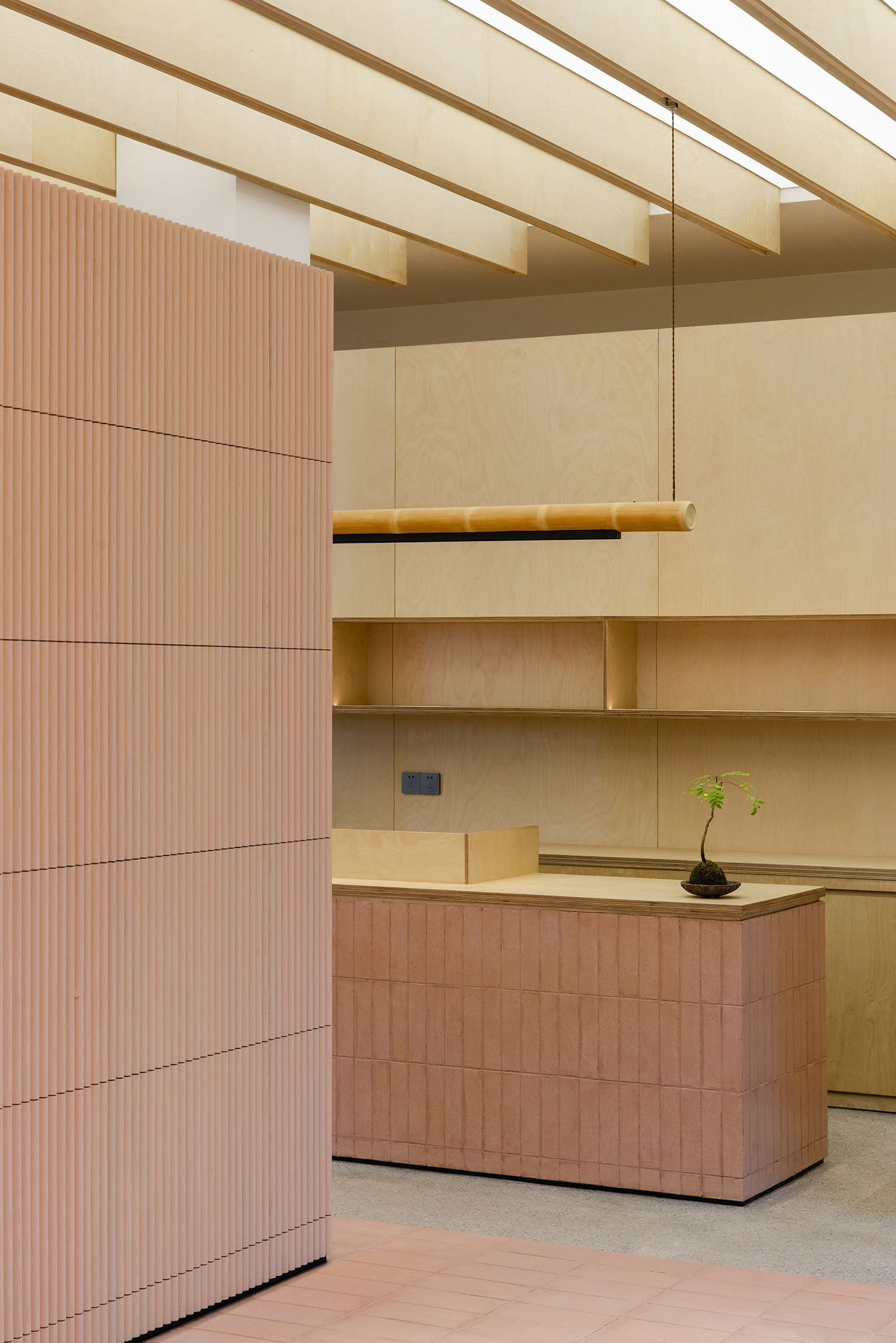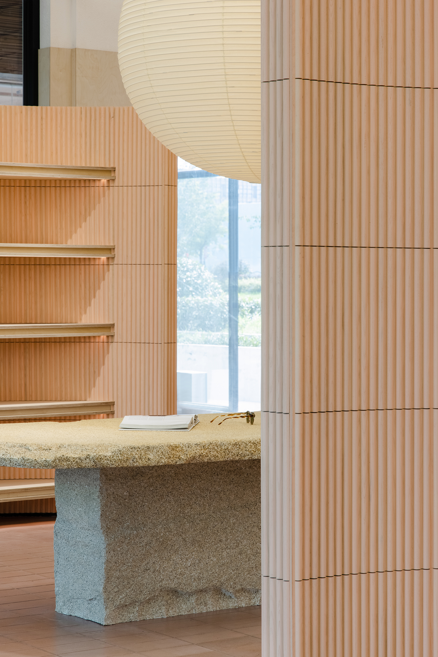 设计师巧妙利用石材的处理与红砖带来的复古韵味,在细腻里谱写了一场自然序曲。整块的岗石被锻造出肌理的质感粗犷有力,生动的形质激活了温柔的环境,营造出微妙的和谐感,流动的空气和变化的光影都成为设计一部分。最后,在自然与城市、场景与人、过去与未来之间创造一个不间断的叙事空间。