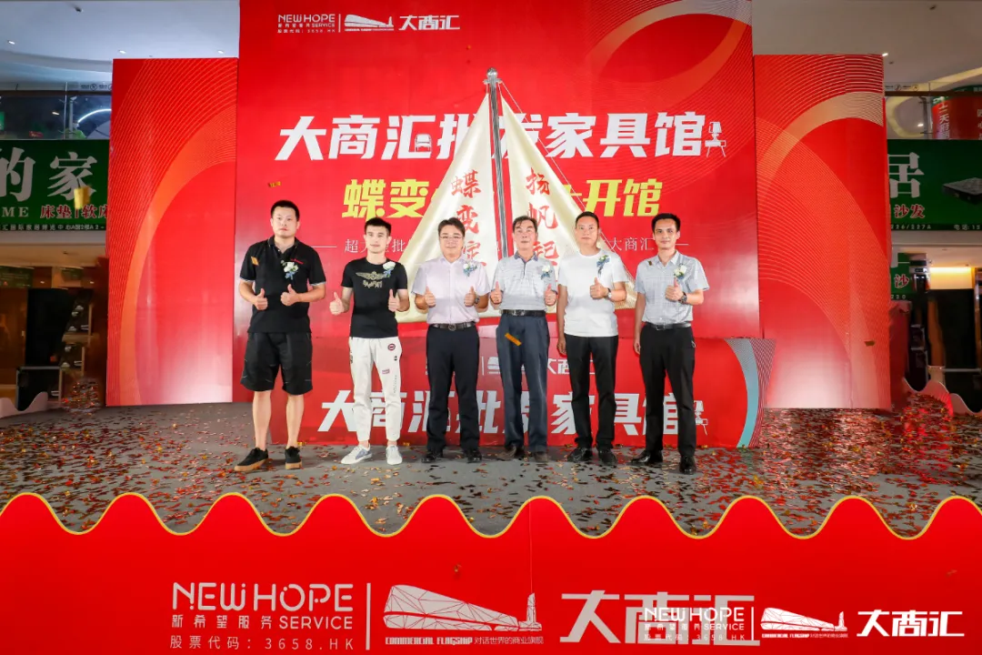 庆典高潮阶段,由新希望服务集团华南区域总经理、大商汇国际家居博览中心总经理孙百乐先生,大商汇国际家居博览中心项目总黎文锋先生,顾森家居广西分公司总经理张坤先生,弘毅家居总经理陆雄先生,矩航家居总经理刘兵朝先生,杜的床垫总经理马培南先生等6位领导共同为大商汇批发家具馆开业扬帆启幕,现场金箔飘扬,金帆载福,在全场来宾的共同见证下,大商汇批发家具馆开馆启动仪式圆满礼成!