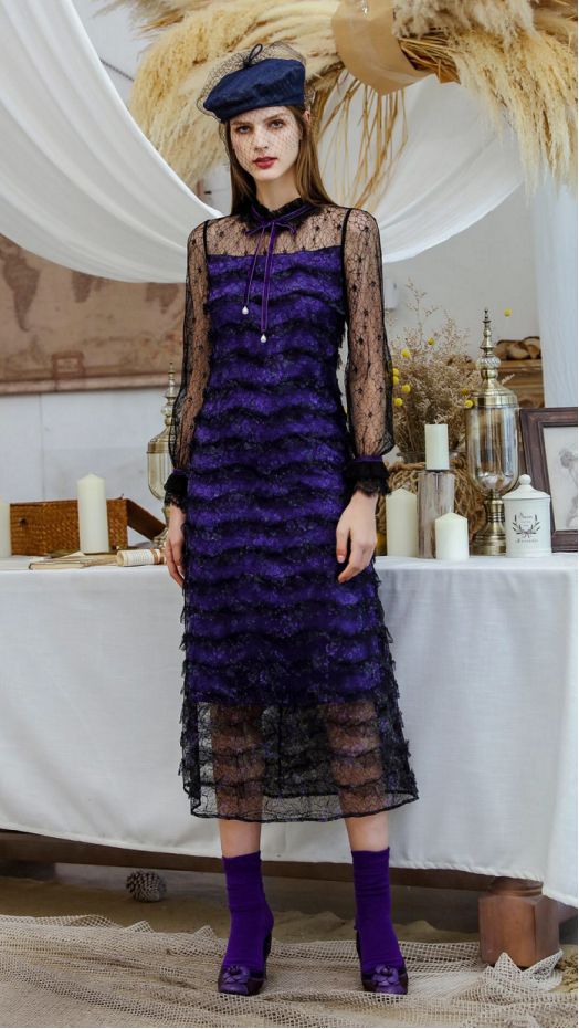 就如这“紫气东来”系列,这款服饰以欧式复古为基调,采用石楠紫的高明度色彩来提亮肤色,蕾丝与网纱拼接,突显优雅、古典的气质。领口是收皱的蕾丝花边,加上缀以珍珠的丝绒织带,低调中泛着华丽光彩。两边灯笼袖,减龄且具有艺术感,中间收腰的设计更是勾勒出女性美好的曲线。