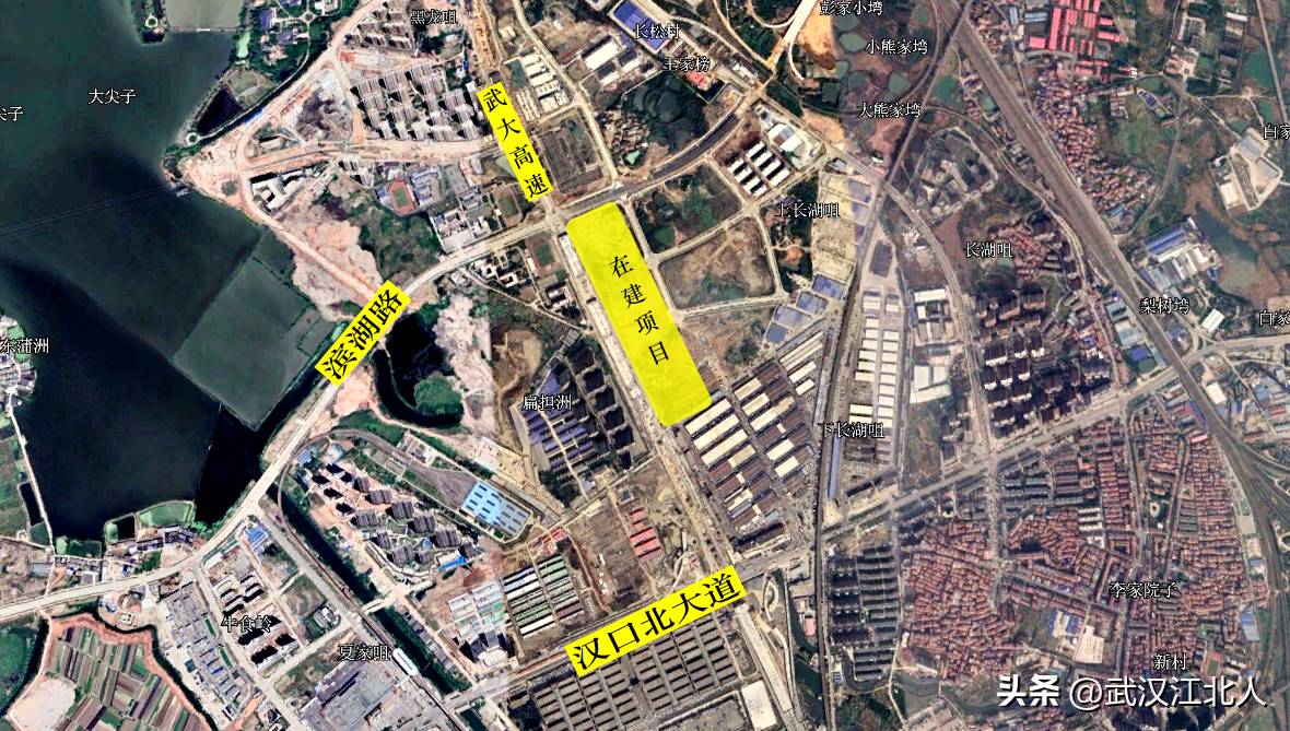 新建的批发市场,位于解放大道延长线(黄陂民间将其作为新十公路的一部分)东侧,其北侧为6车道的滨湖路,南侧为四季美海鲜市场,在卫星地图上的大致位置如下(2022年下半年才开工,最新的卫星图像为2022年中,所以还看不到这些建筑)