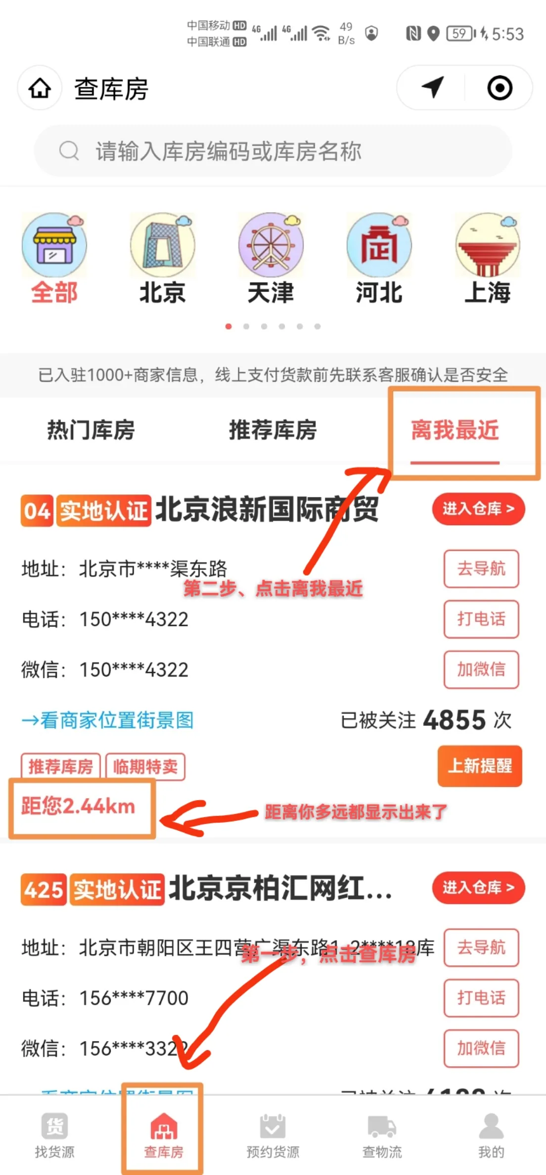 第二步、点击右上角的离我最近,这样离你最近的货源方就会显示出来,甚至距你多远都会显示出来。