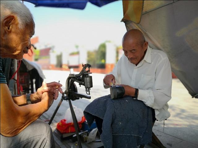 再往西走不多远,见到青年西路北旁有一位补鞋匠,今年90岁整,耳不聋,眼不花,穿针引线样样行,日收入20块钱左右,很享受现在的日月。