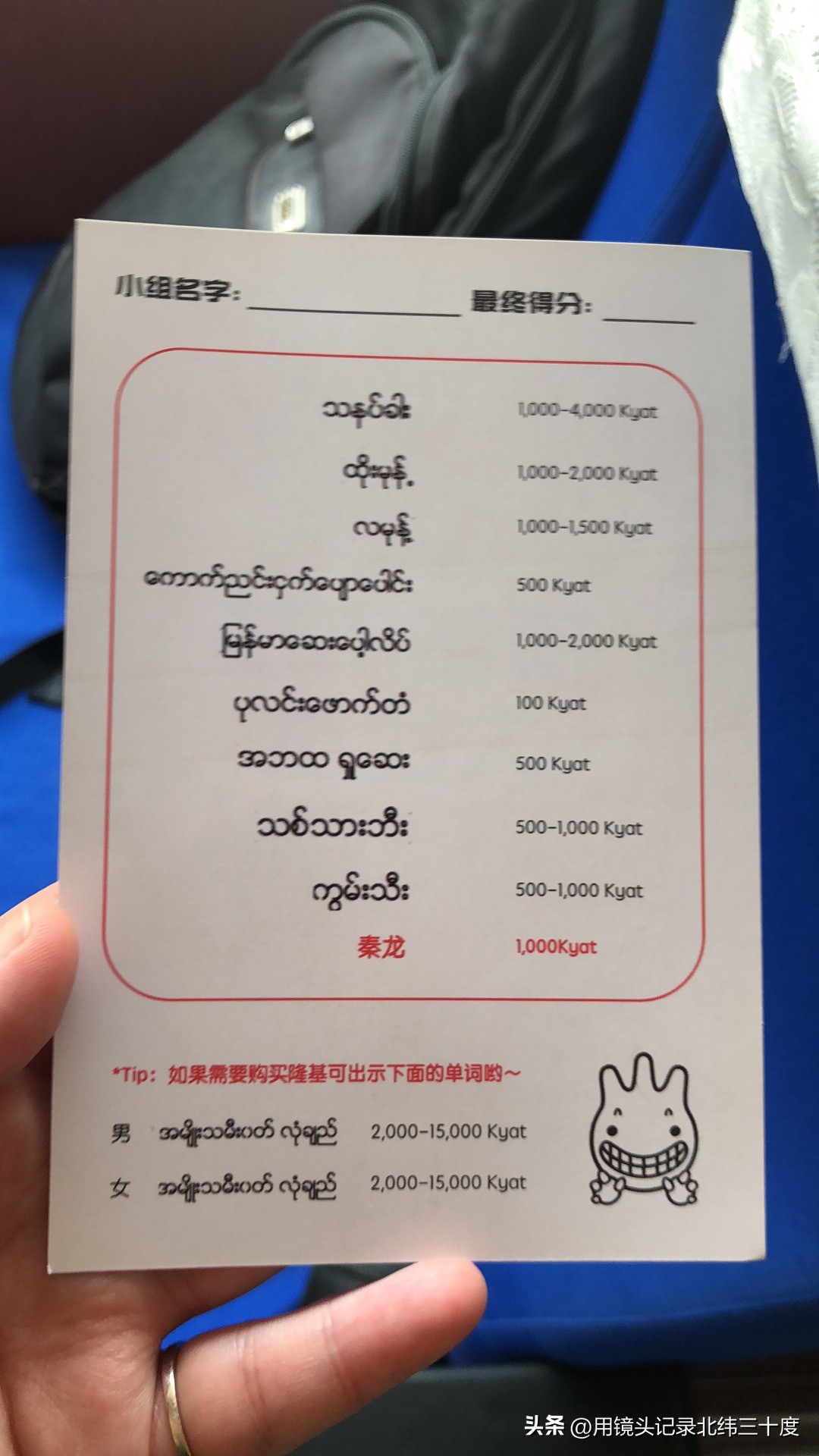 吃完饭后我们就去采椒市场,这个市场是曼德勒最大的市场,zay cho的意思是便宜货,一般都是其它国家或者城市到曼德勒需要批发一些商品的,但这里一般都是批发零售都行,当然也有不零售的。由于昨天休市,所以今天会比往常更挤。领队给了我们一张购物清单(为了让我们更好的与小贩沟通,soe还把商品读了一遍,然后貌似并没起到做什么作用)和5000(200当地币=1人民币)的当地货币,4个人一个组,人数最多的小组有奖励,其实这个环节的重点是想让我们深入曼德勒的市井。这个市场是曼德勒最大的市场,并不是游客会来的地方,所以保留了很好的原生态。我们愿意的话,也可以在这里买隆基,为后续的拍照准备。下车之前soe还特意提醒了这里的价格很灵活,如果我们够聪明,可以以很低的价格,甚至是免费得到商品。