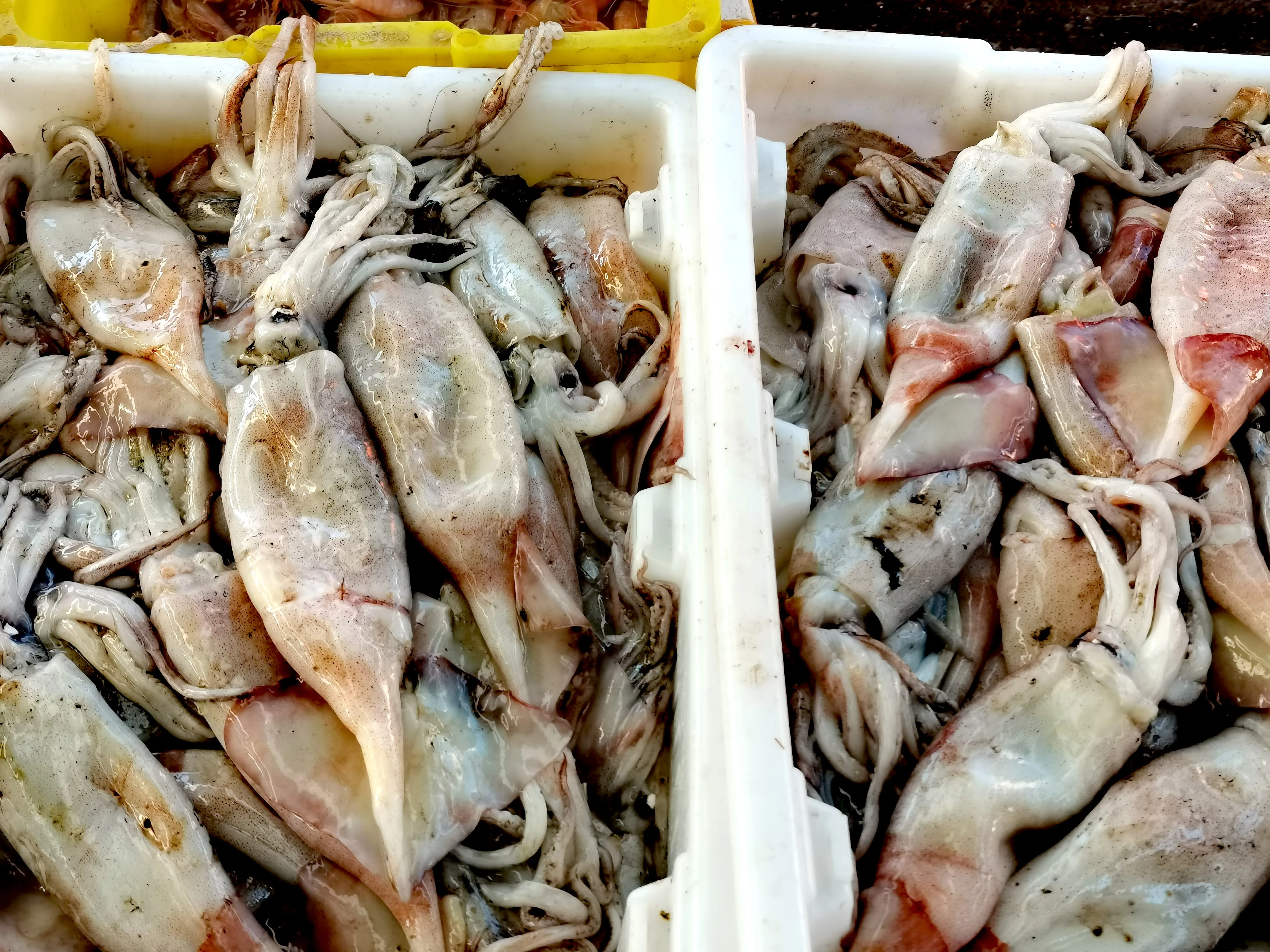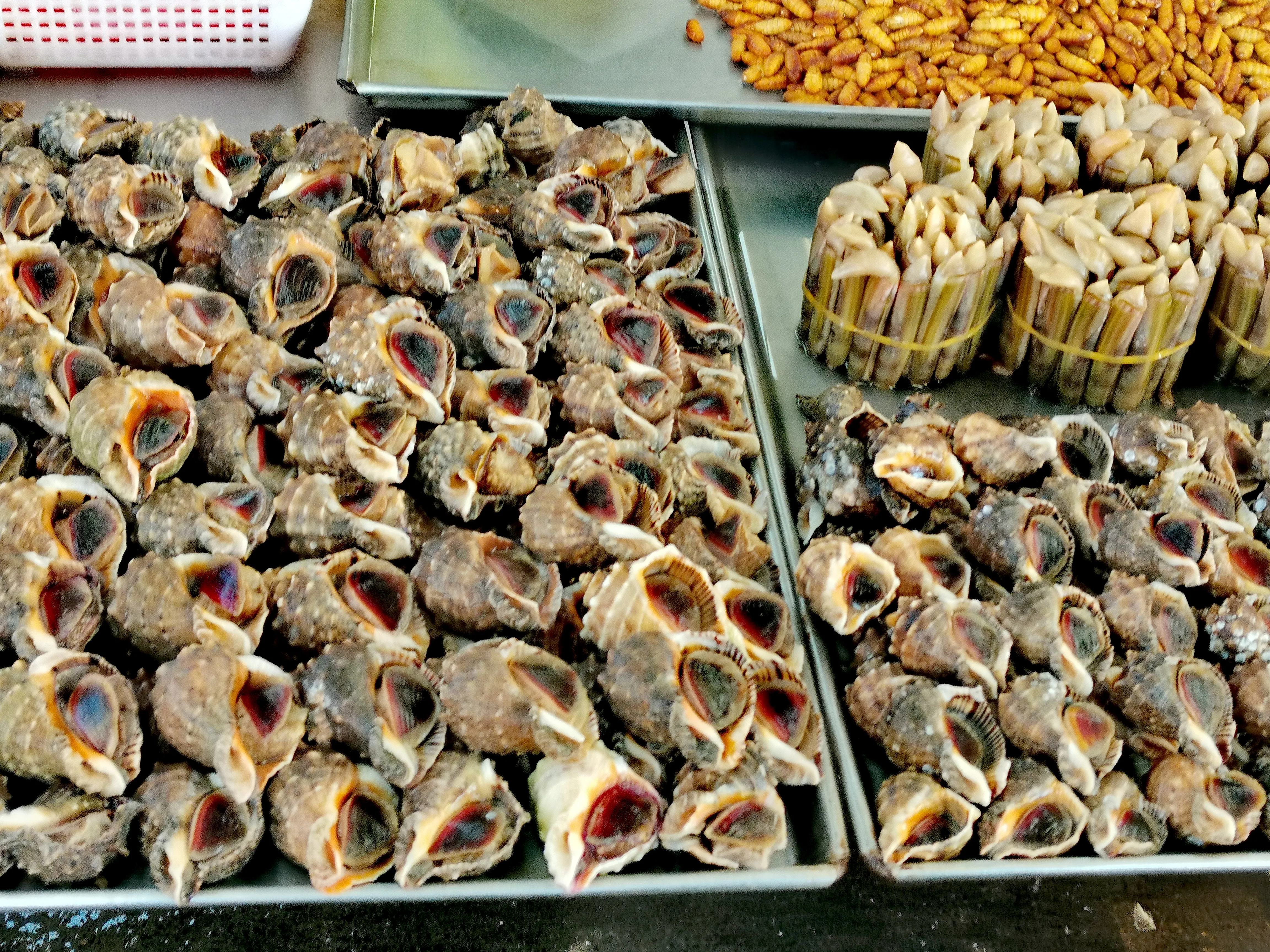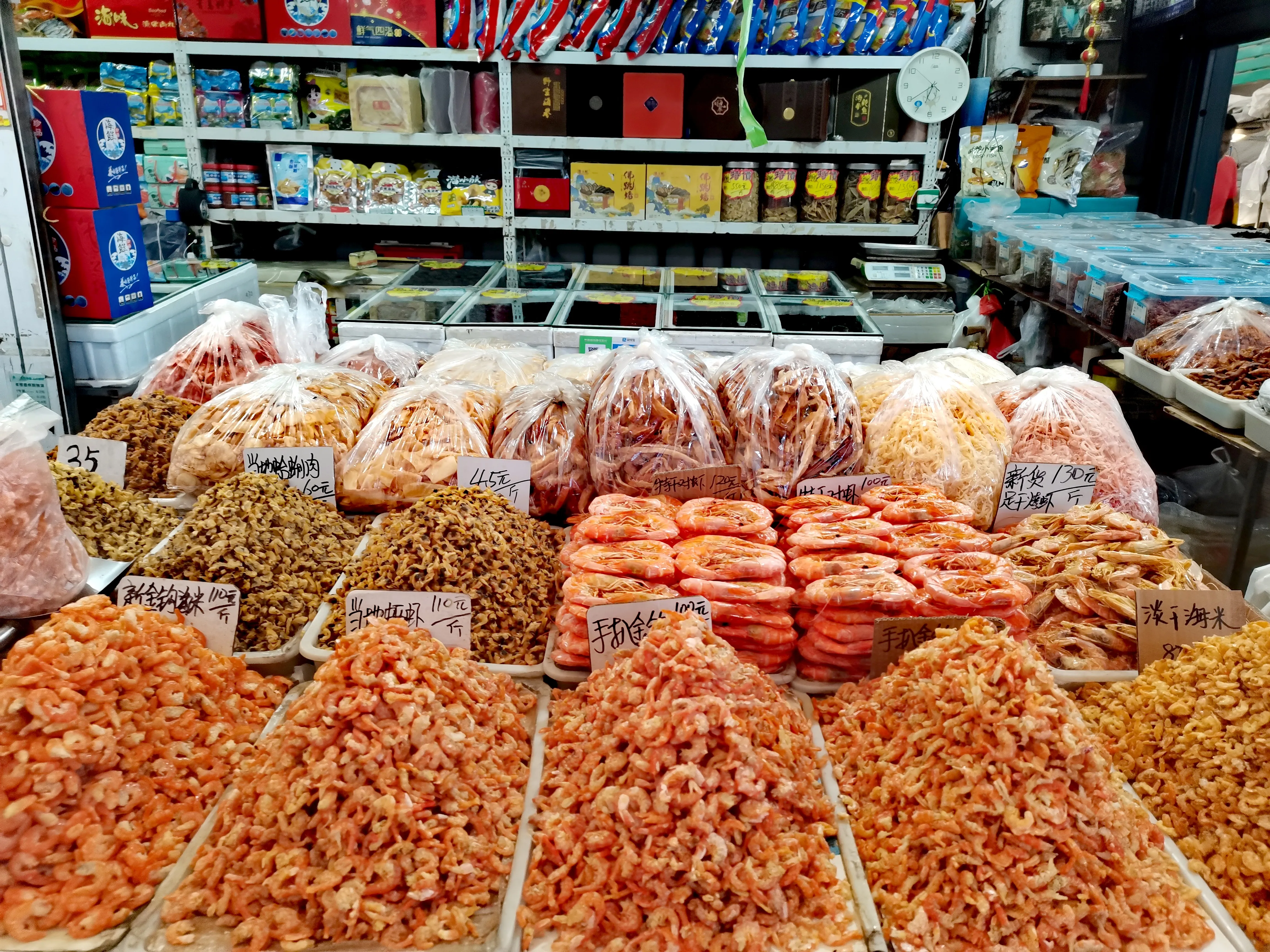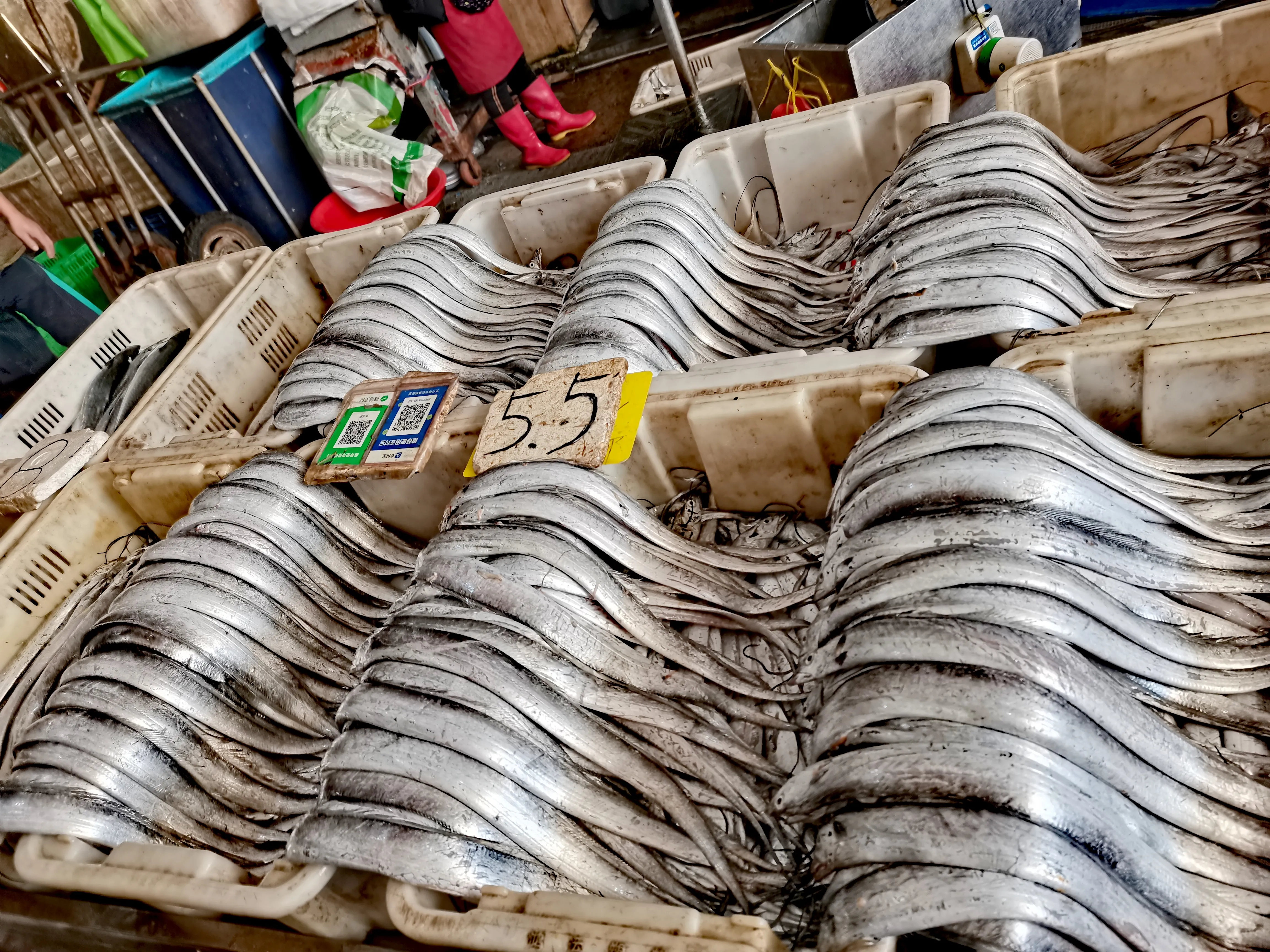 这个市场真是名副其实啊,卖蔬菜的、水果的、海鲜的、猪肉羊肉鸡肉的、干果调料的、米面粮油的、馒头面包小吃的……数不胜数,一条街一个产品,井然有序,尤其各种海鲜鱼类让我这个西北人大开眼界,活蹦乱跳的大螃蟹,大虾,叫不上名字的鱼,奇形怪状的贝类……哇塞!好丰富啊,再看价格,也便宜的出奇,在西安螃蟹可是论个卖的,这里一斤三四十元,新鲜出海的带鱼才买5.5元一斤,西安最便宜也要十五元左右,大哥买了三四十个螃蟹,我买了七八斤带鱼,我最喜油煎的带鱼,这下可要好好的过把瘾了!
