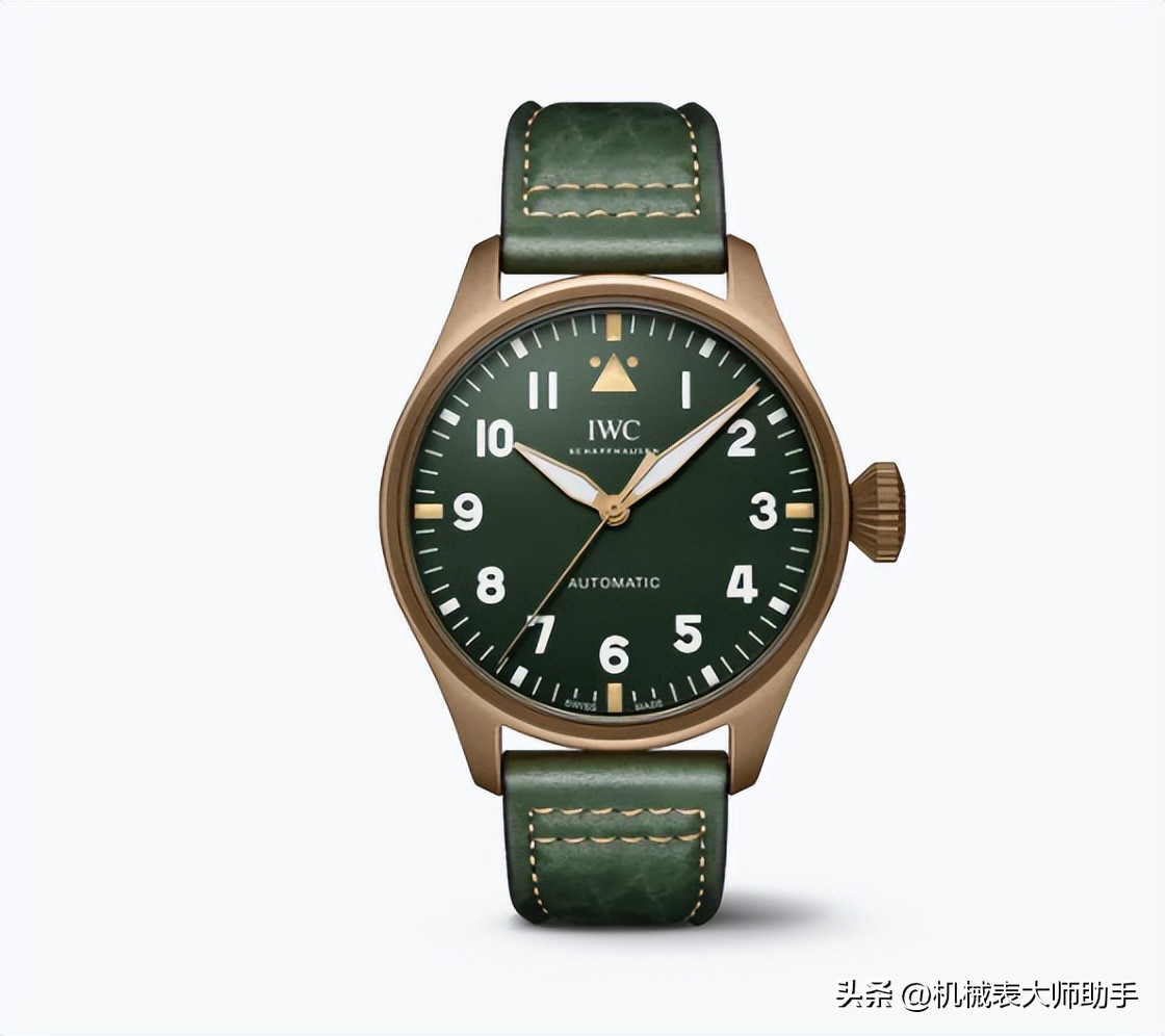2021年推出的万国喷火战机大型飞行员表径43毫米,完美的解决了尺寸问题。并且同时把飞行员和大型飞行员的优秀设计全部兼容。青铜材质的表壳让这款表的复古风格拉满,表盘和表带都采用军绿色,指针跟重要时标的镀金色泽与青铜壳体和谐辉映。