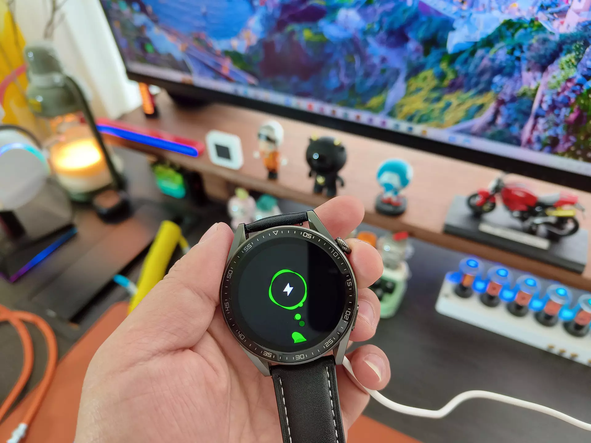 先来简单开个箱,打开包装可以看到黑色皮质表带的手表了,除了手表主体外,还有磁吸充电器,以及说明书。整体来看,这款手表设计很简约,皮质表带很耐看,也更有品味。
